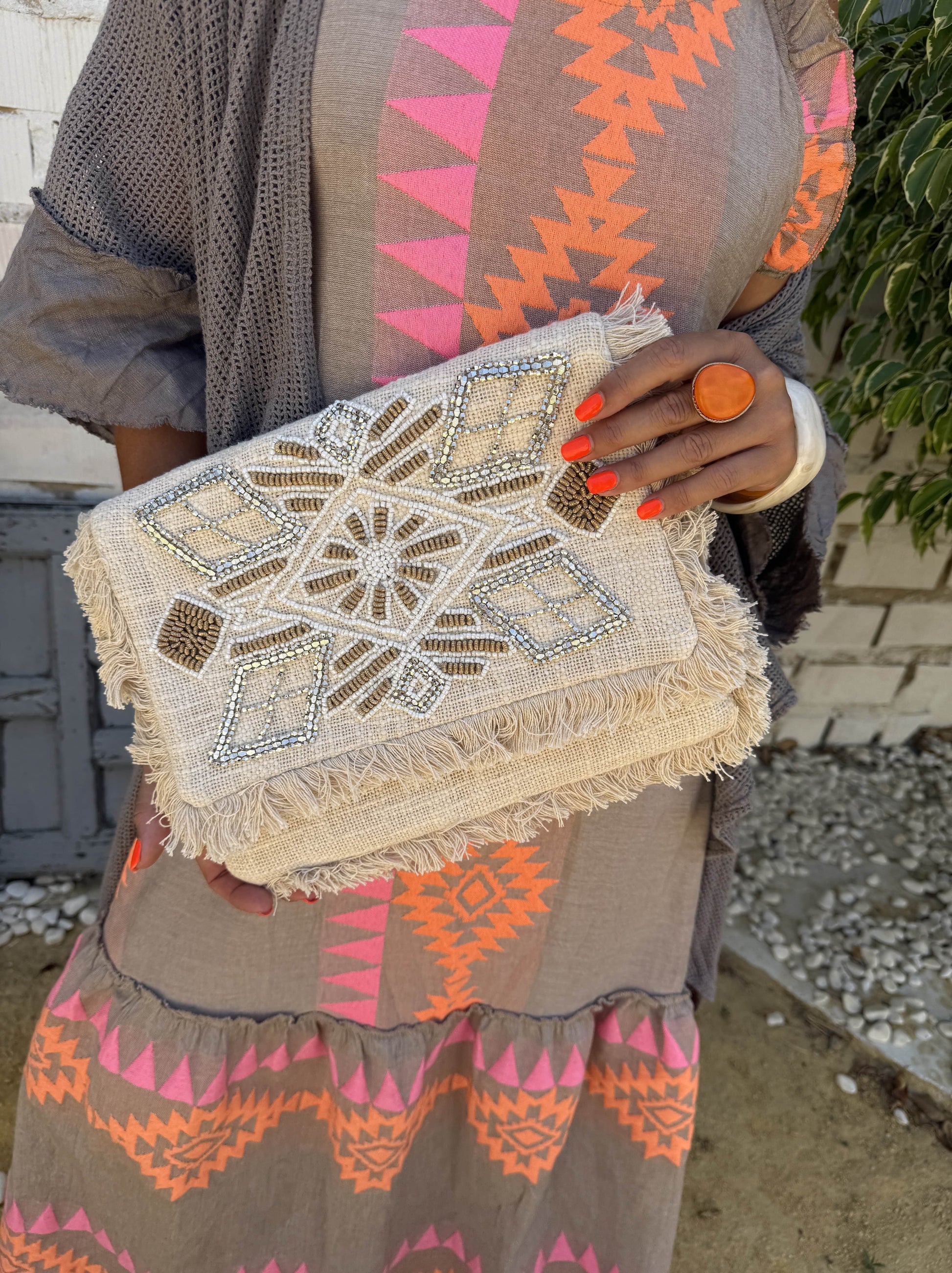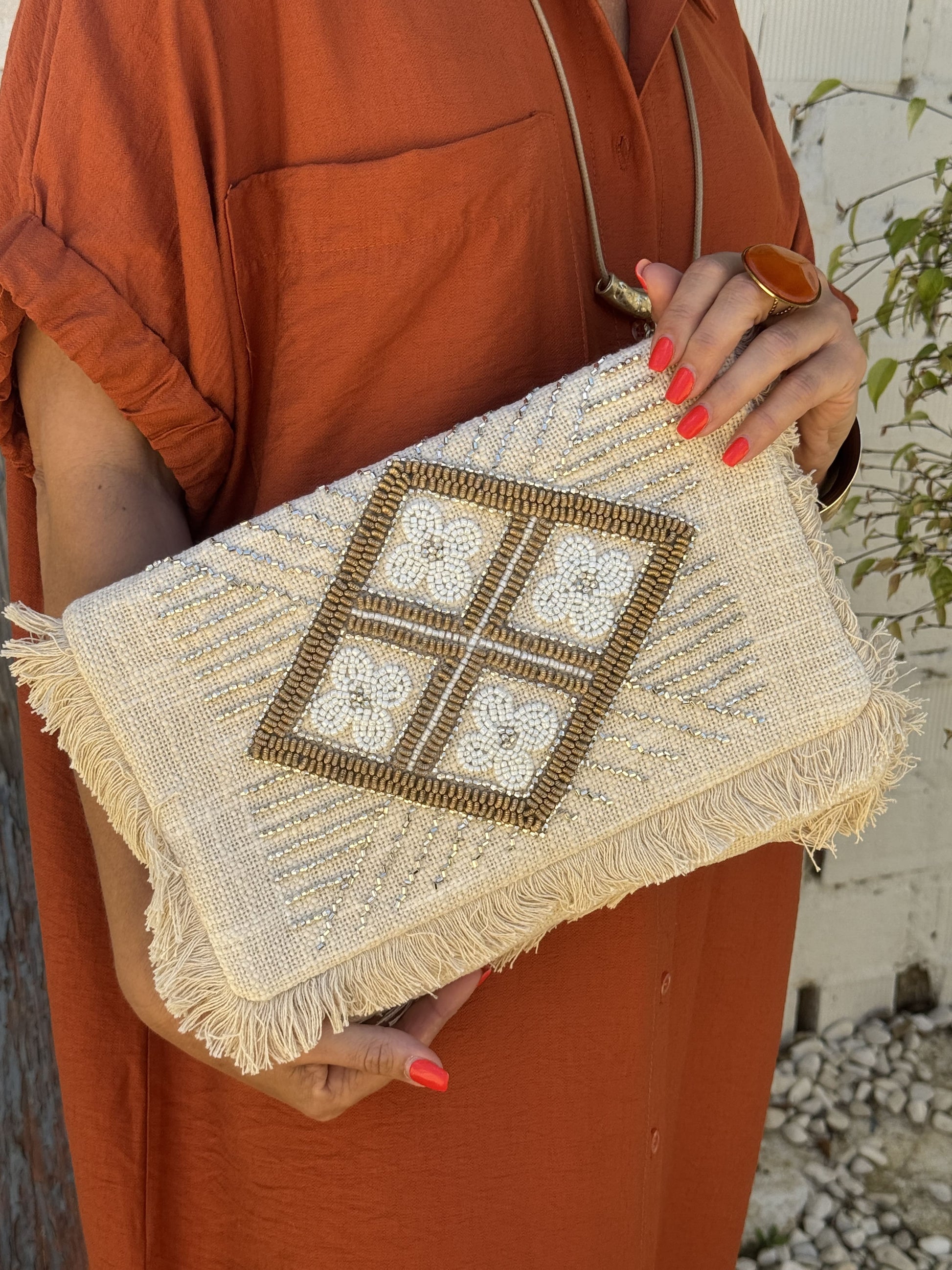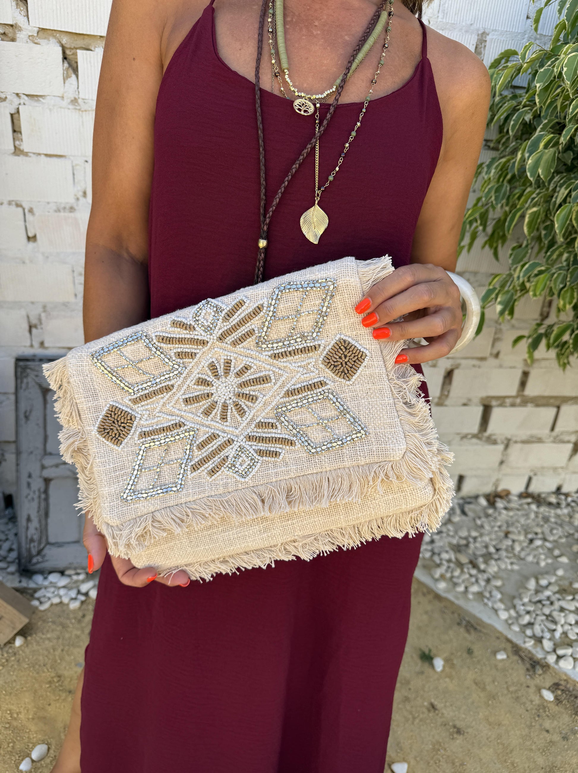 Cartera de mano estilo ibicenco con pedrería en tonos dorados, plateados y blanco.