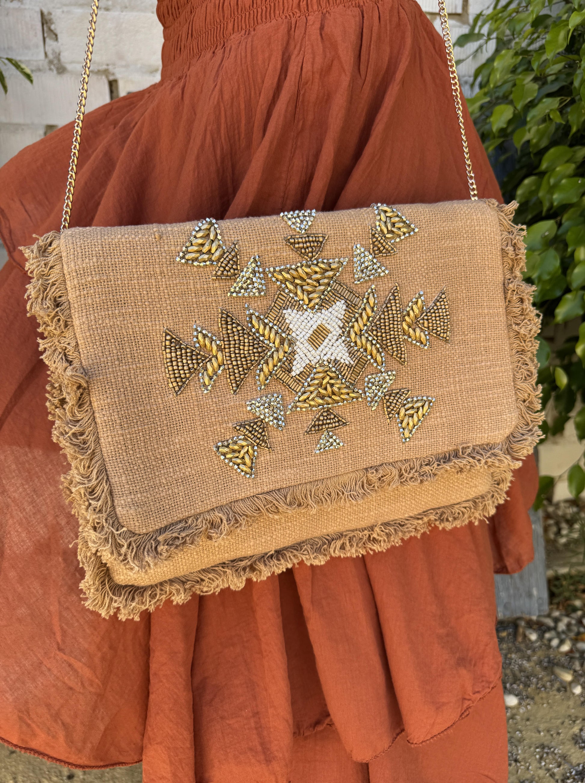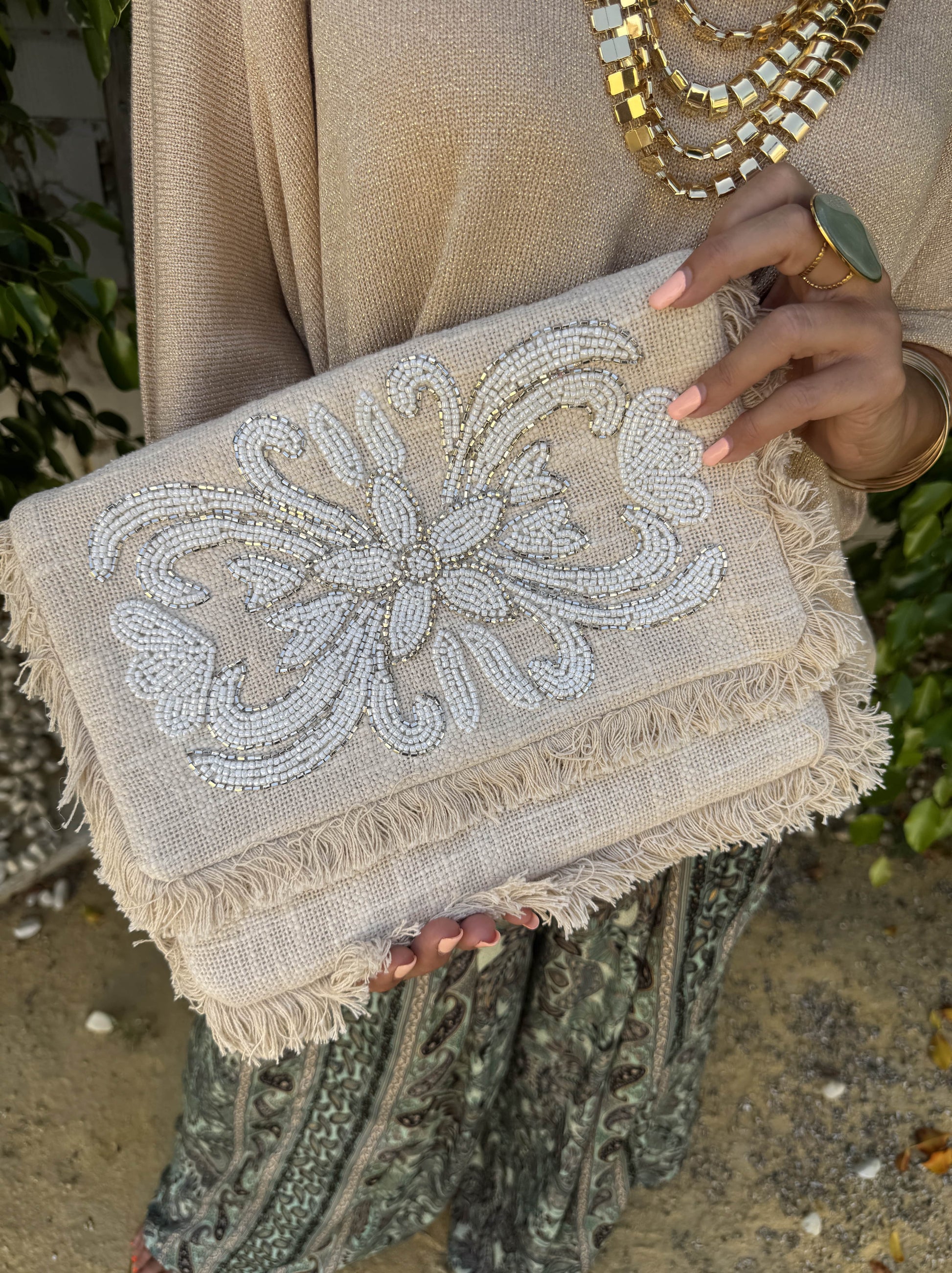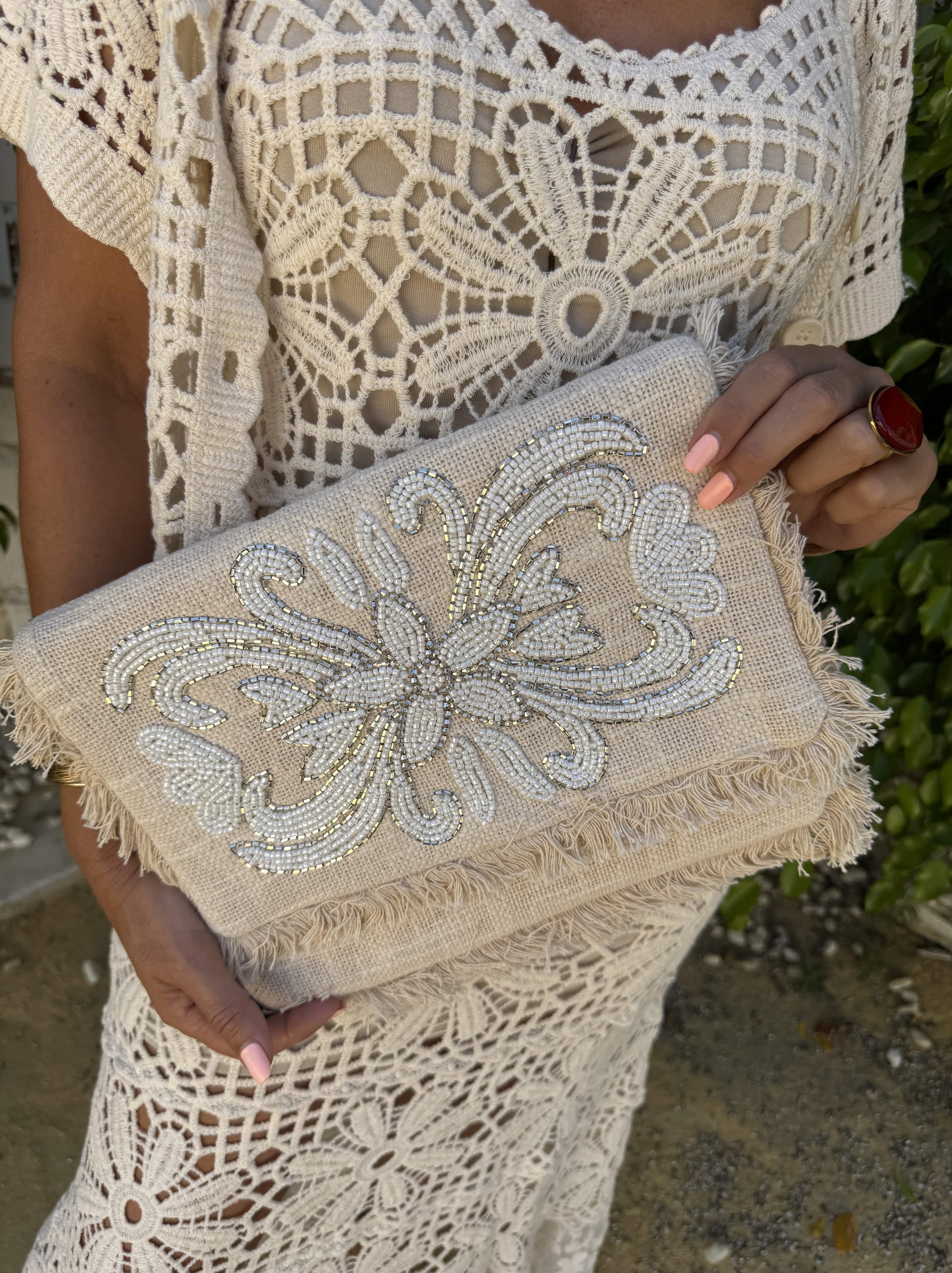 Cartera de mano estilo ibicenco con pedrería en tonos dorados, plateados y blanco.