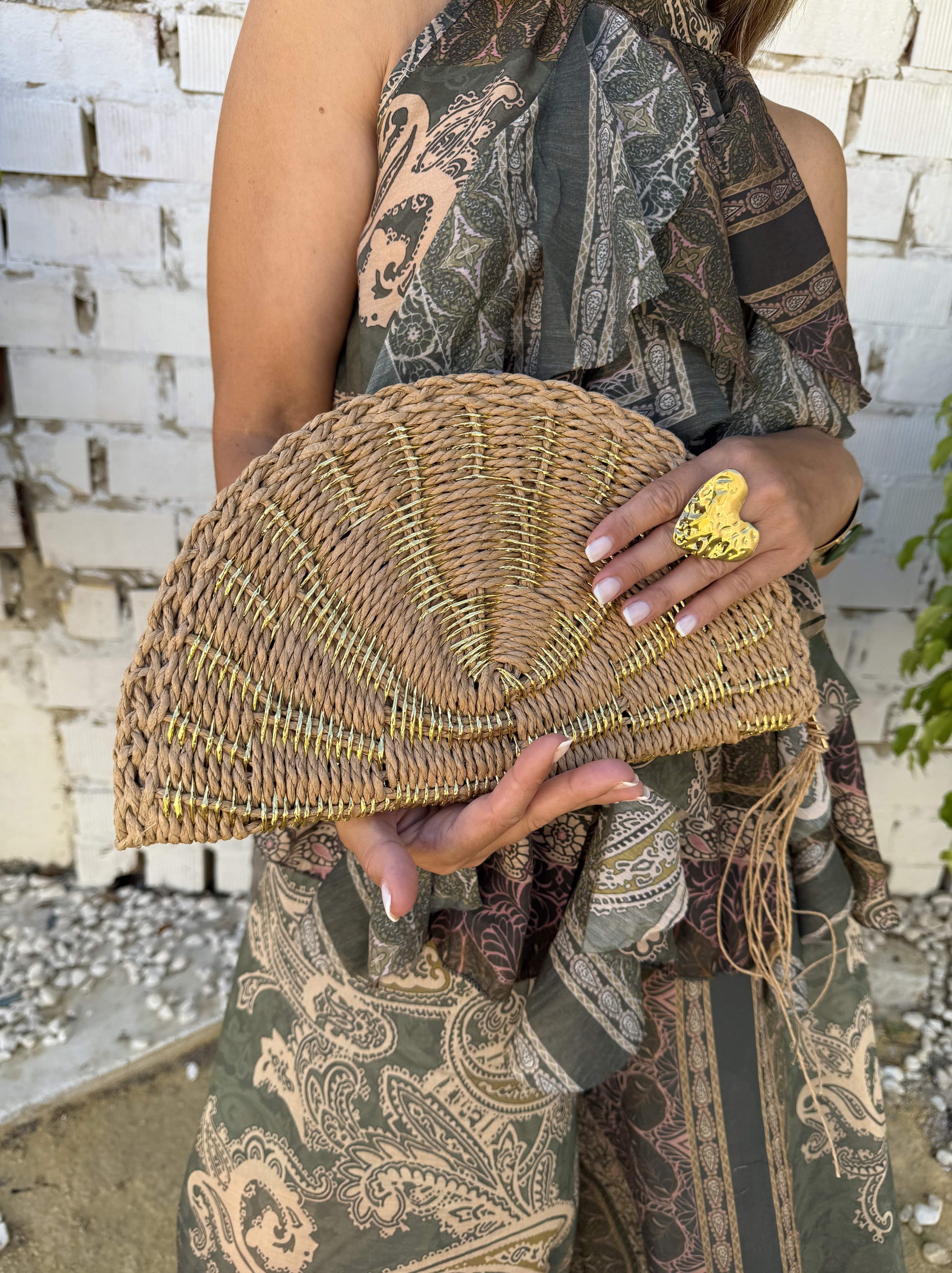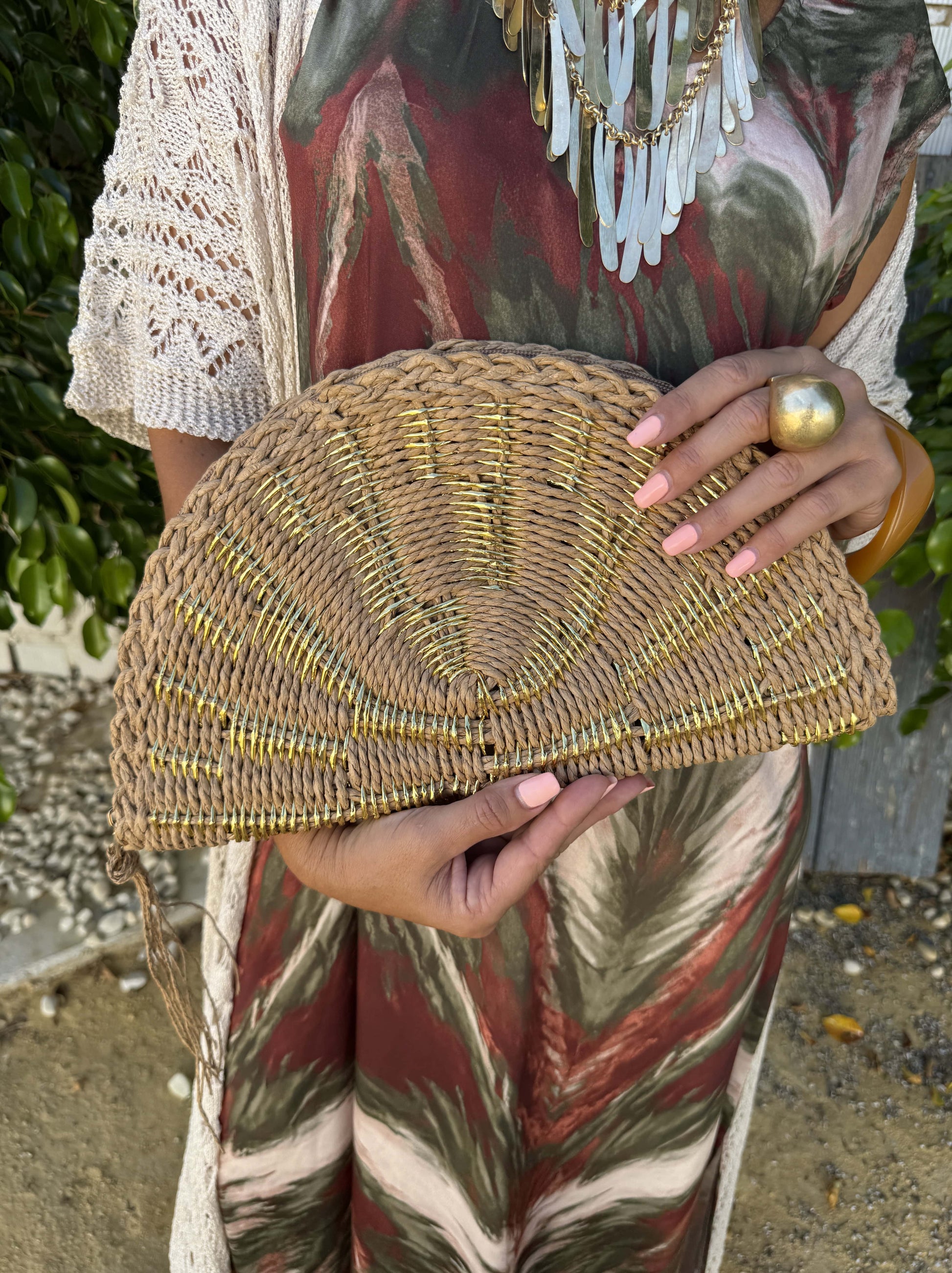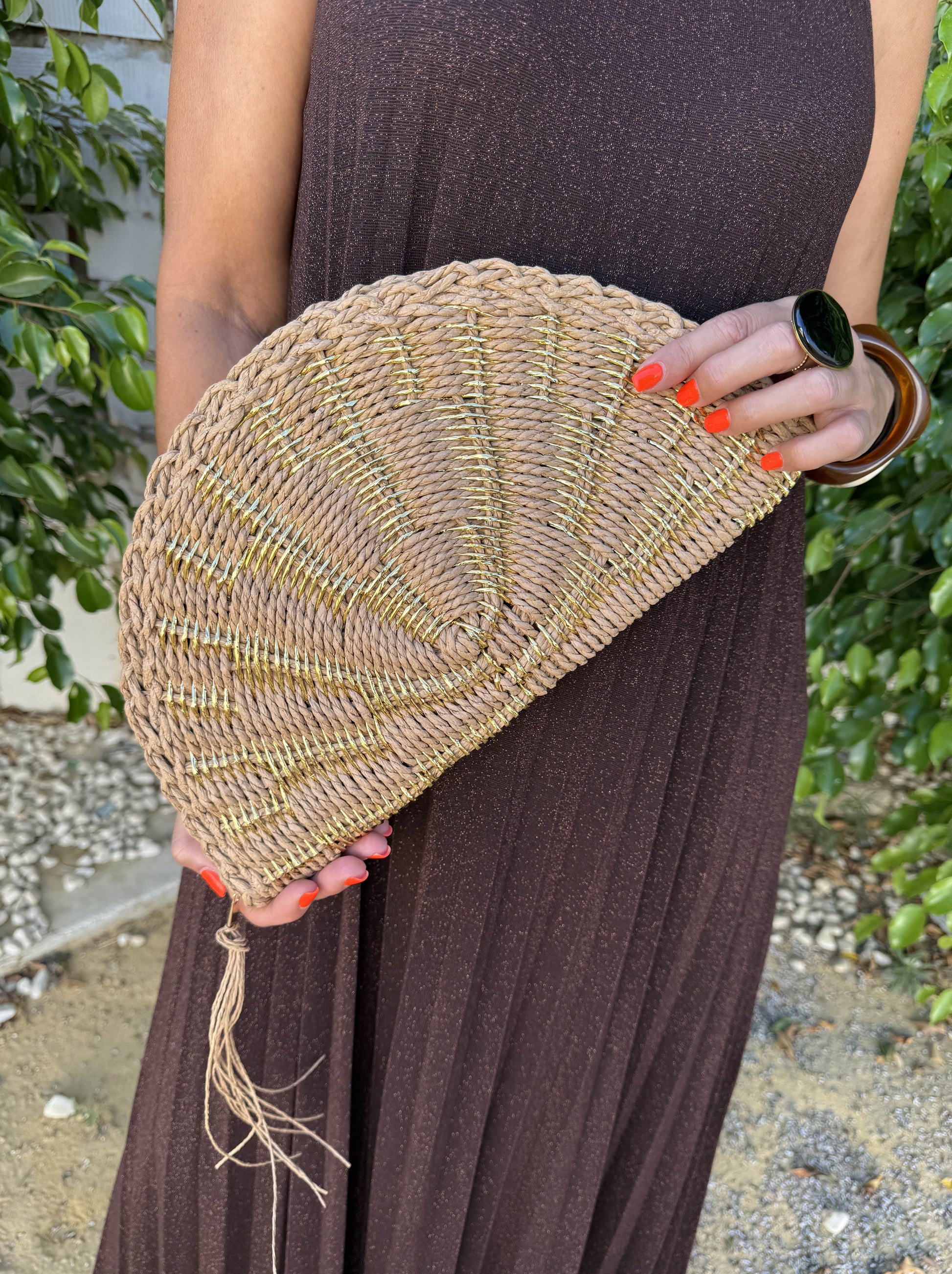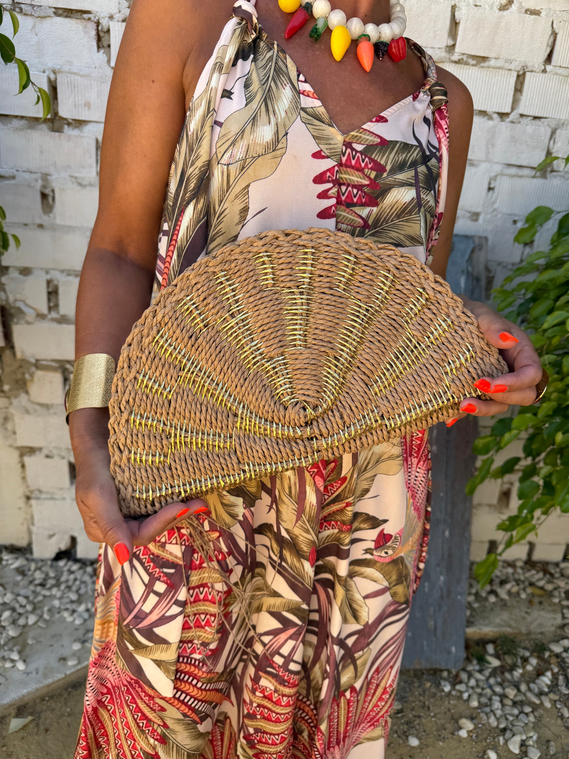 Cartera de mano tipo rafia con forma de abanico y detalles dorados.