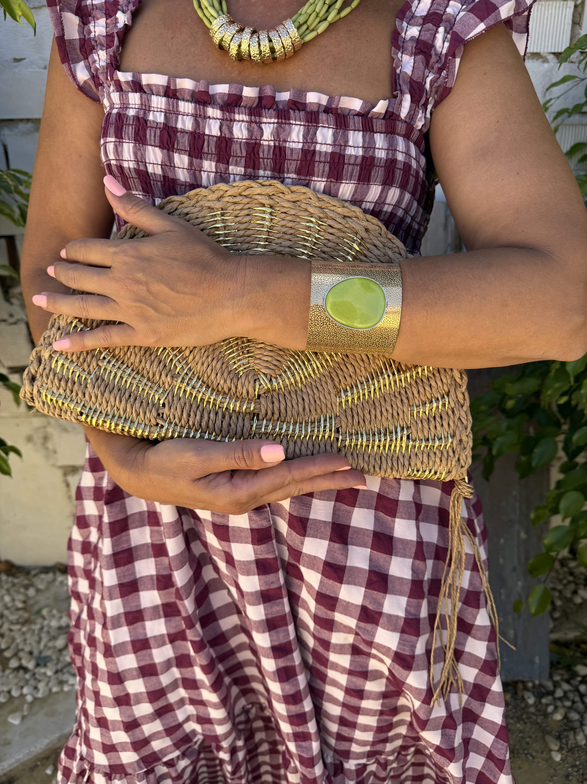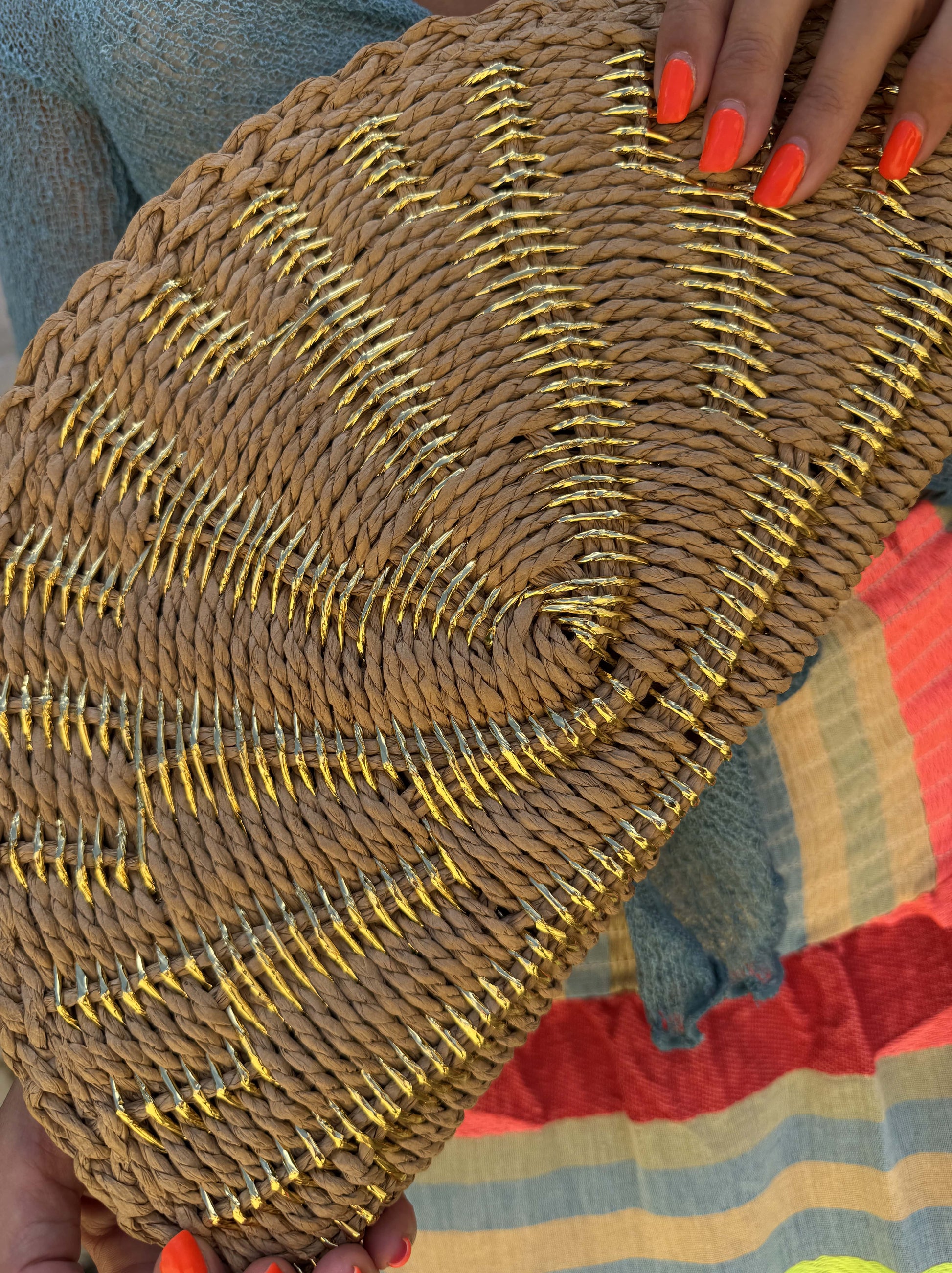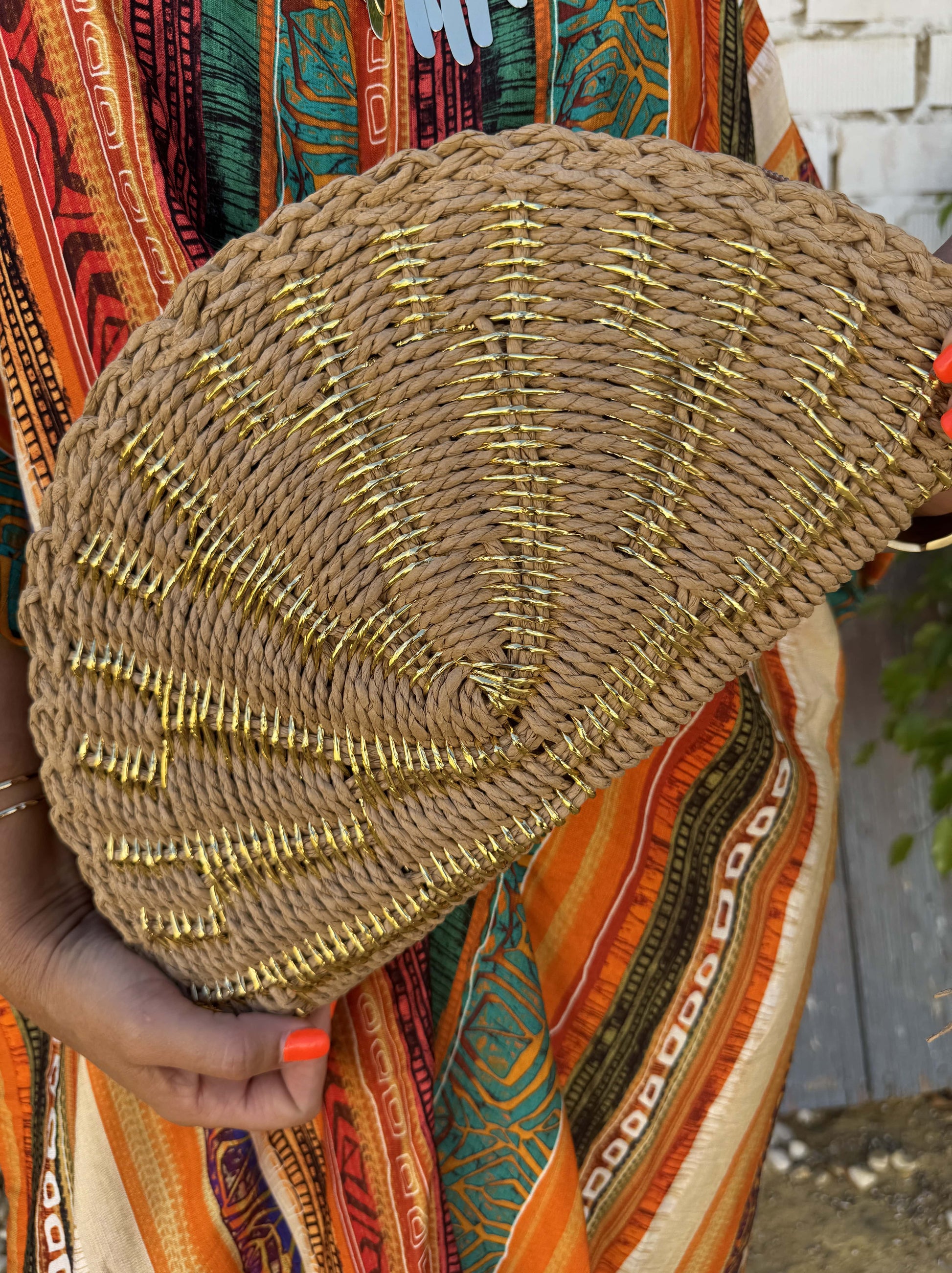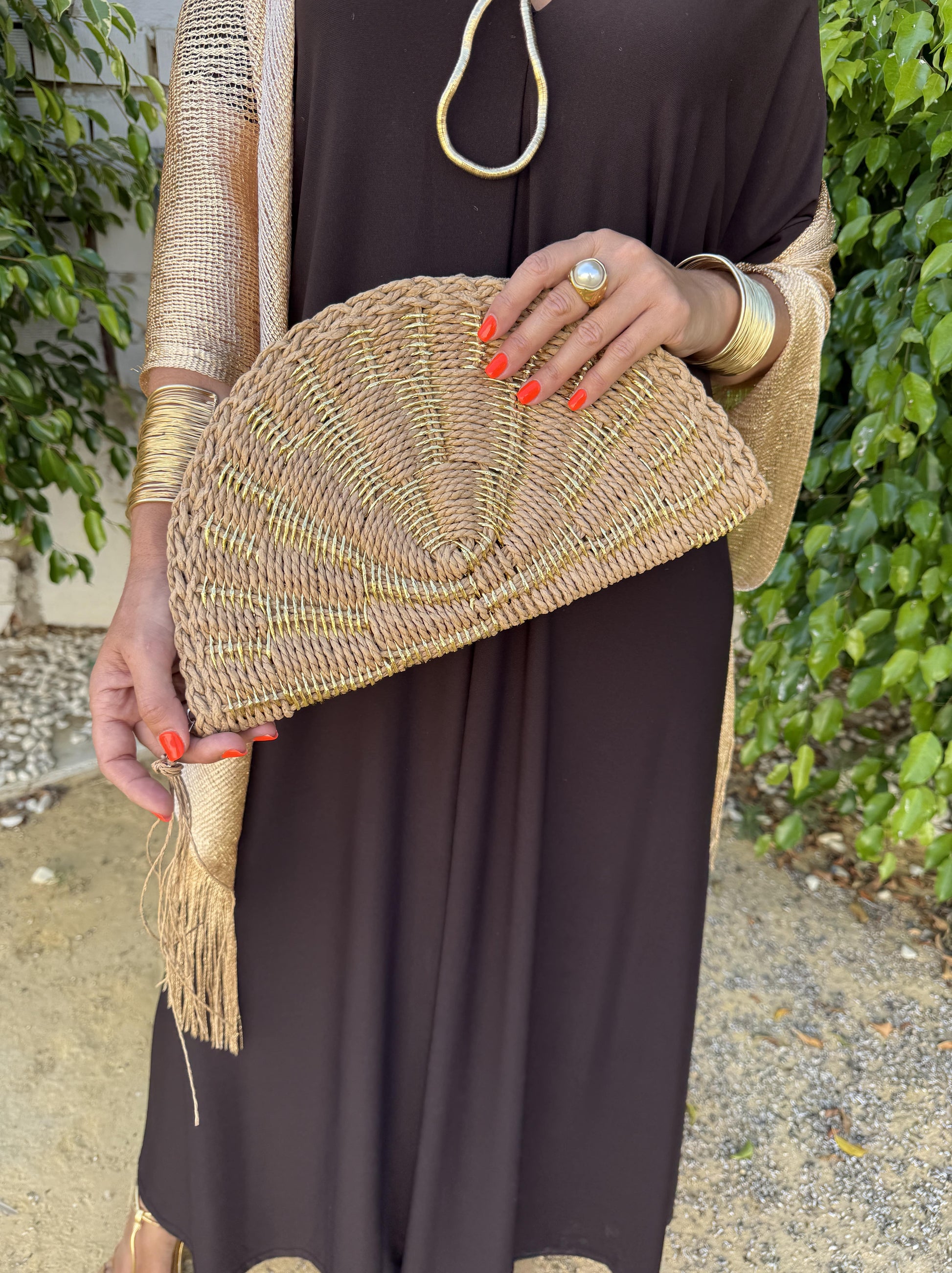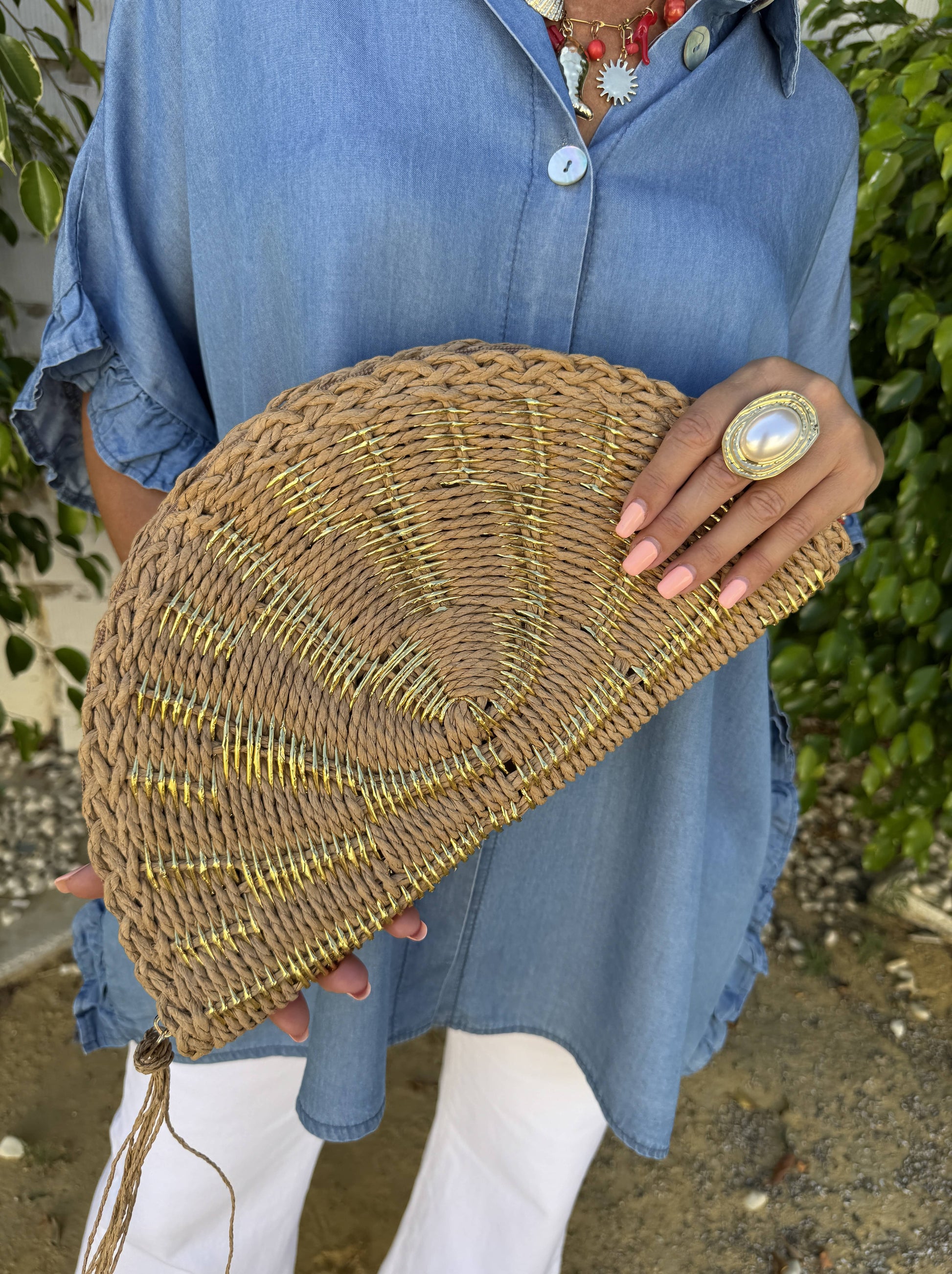 Cartera de mano tipo rafia con forma de abanico y detalles dorados.