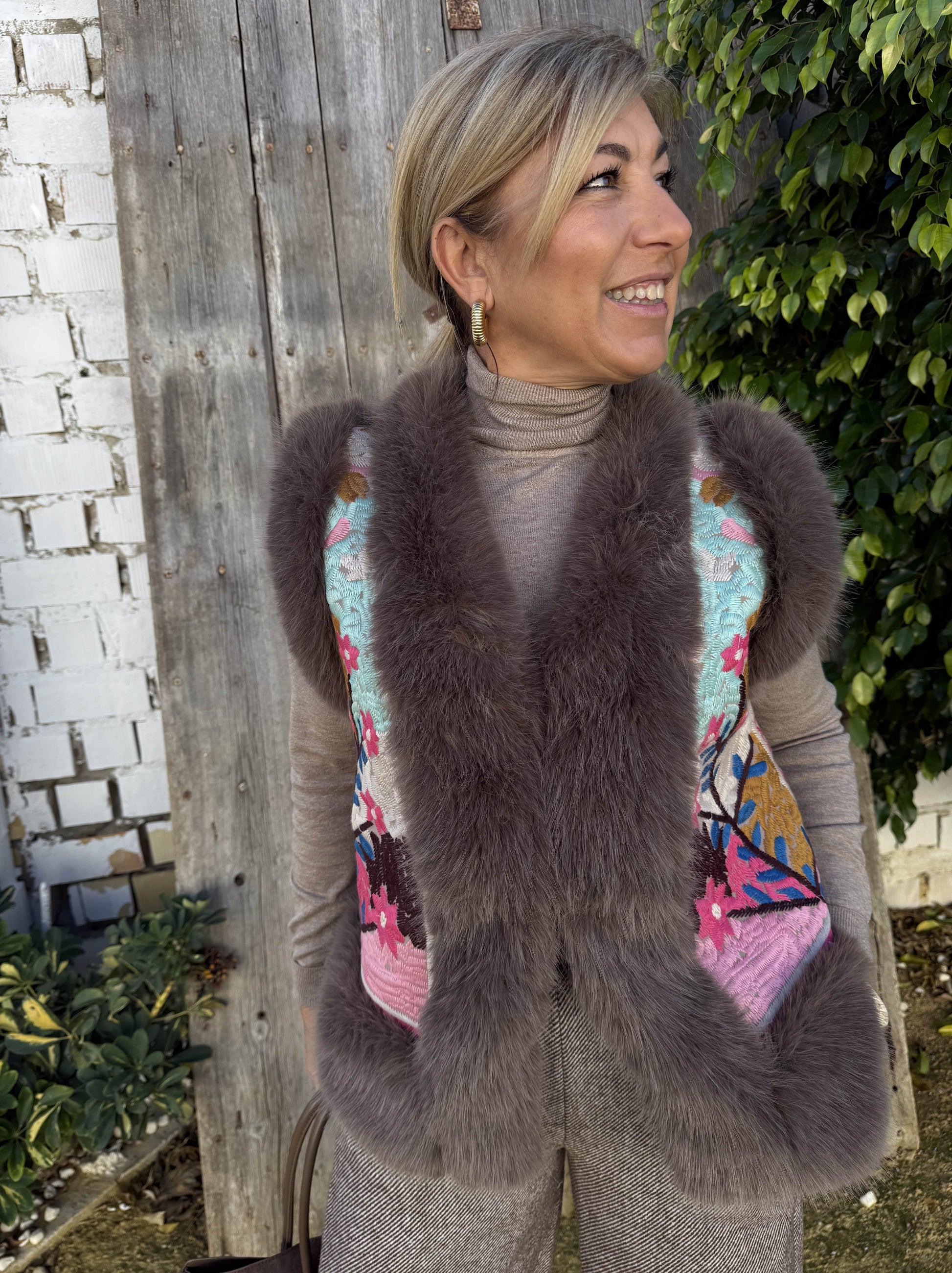 Chaleco de pelo en el borde con bordado de flores en tonos pastel.
