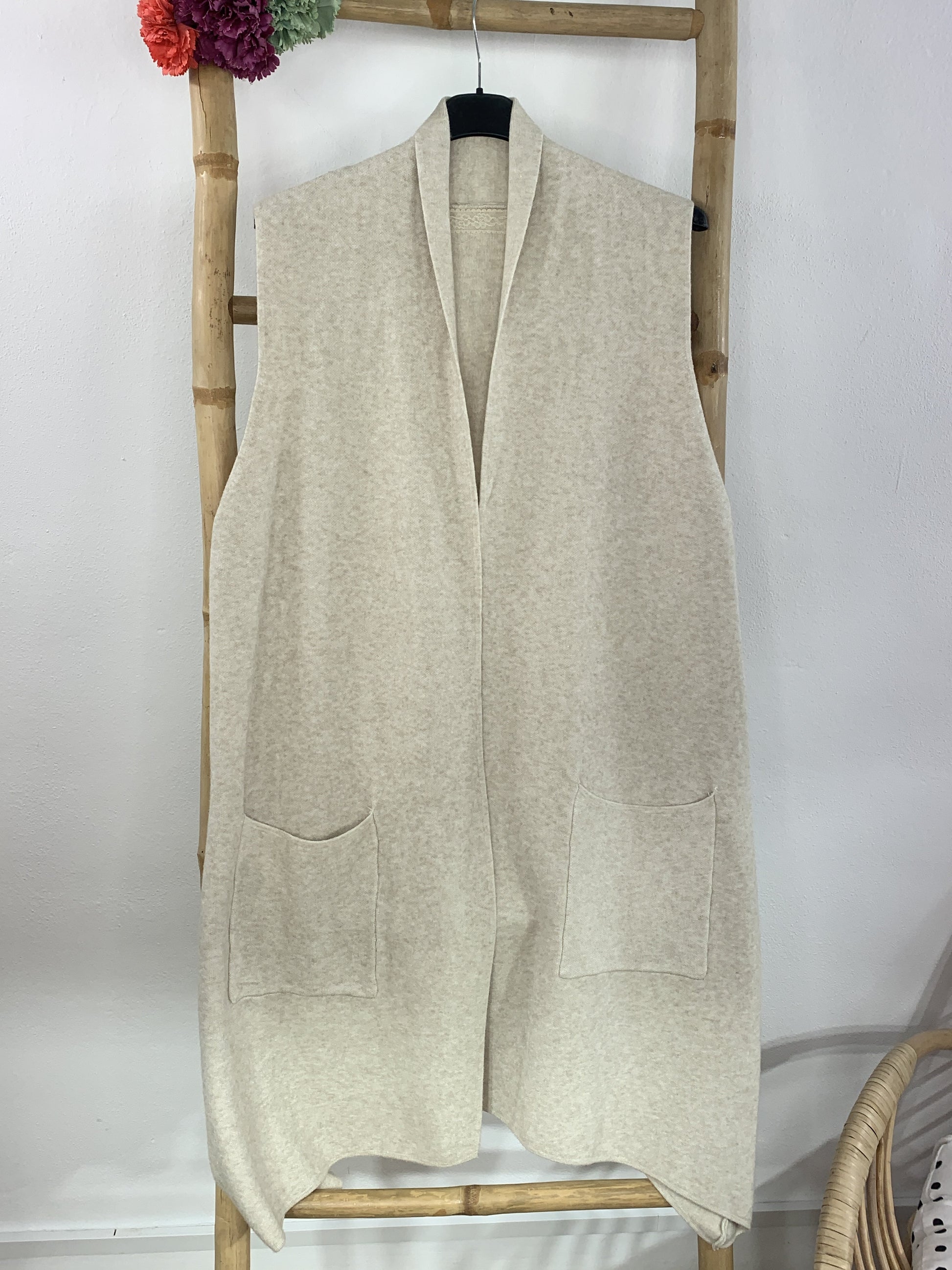 Colete feminino de malha, sem mangas compridas, com bolsos na zona frontal.