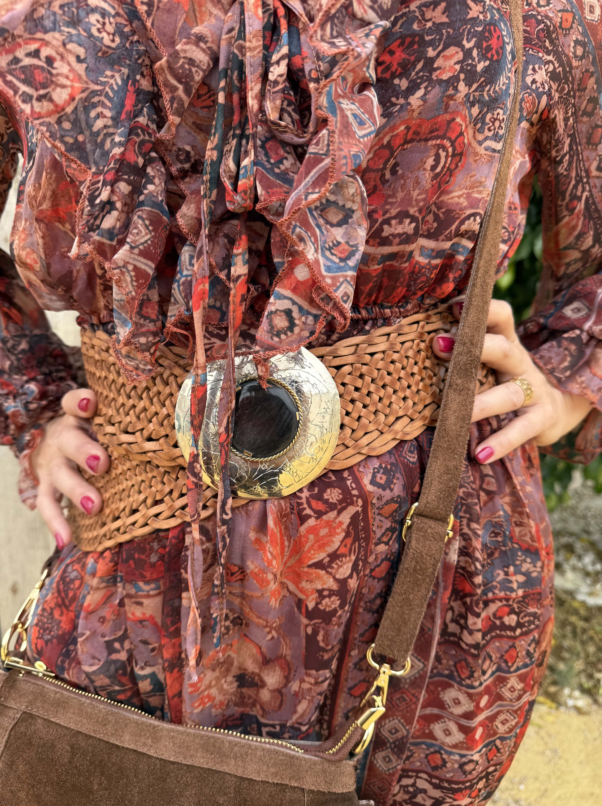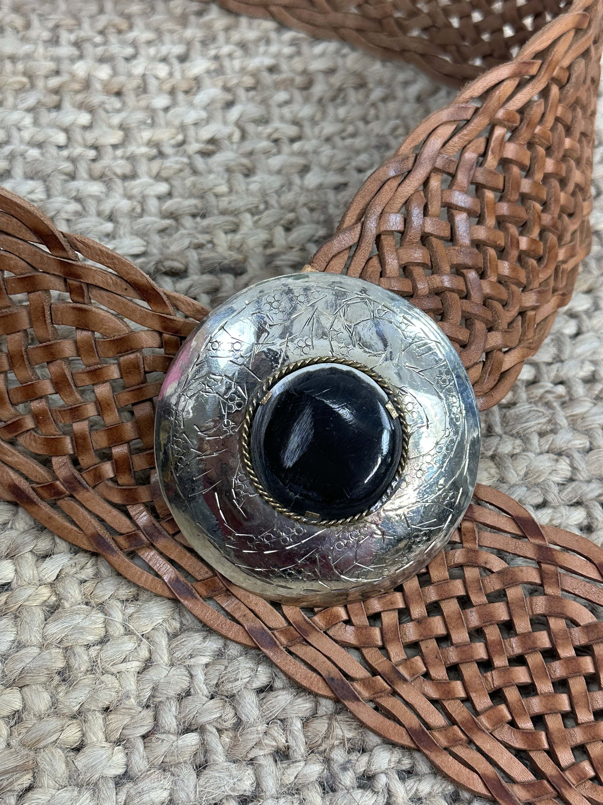 Cinto largo de couro vazado com fivela frontal prateada e pedra no centro.