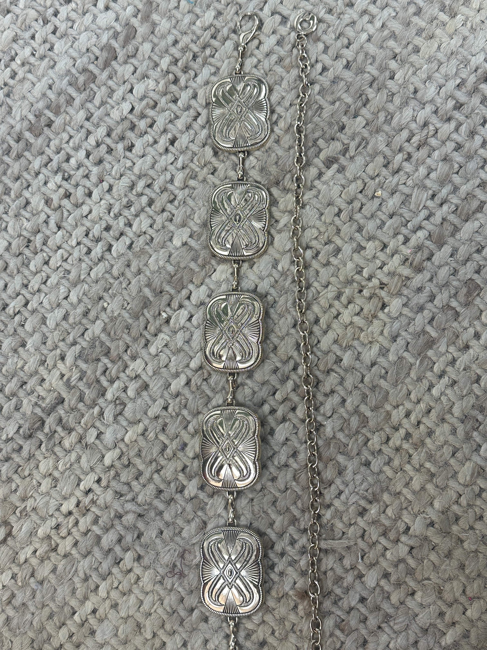 Cinturón metalizado estilo cowboy con zonas de cadena.