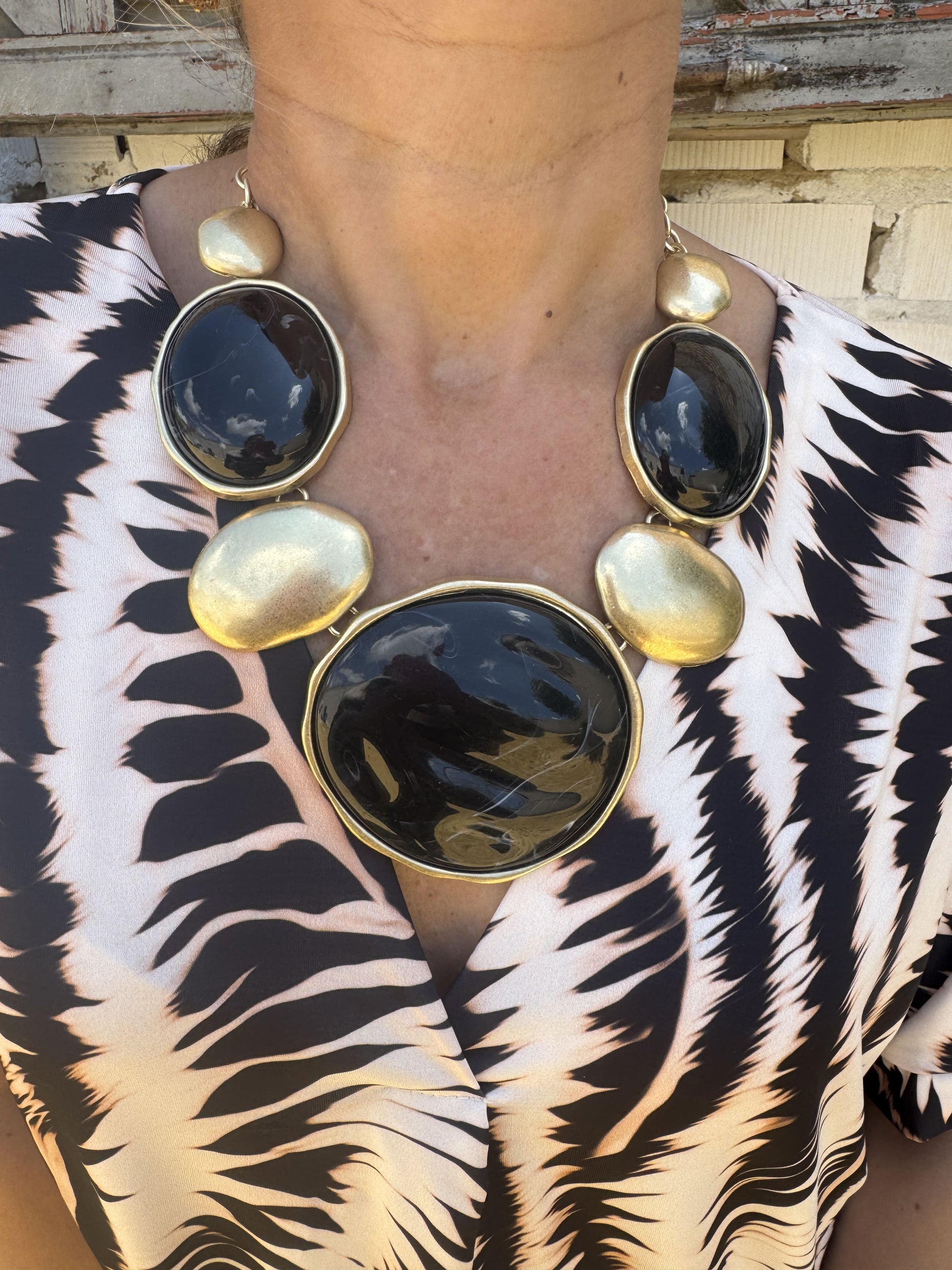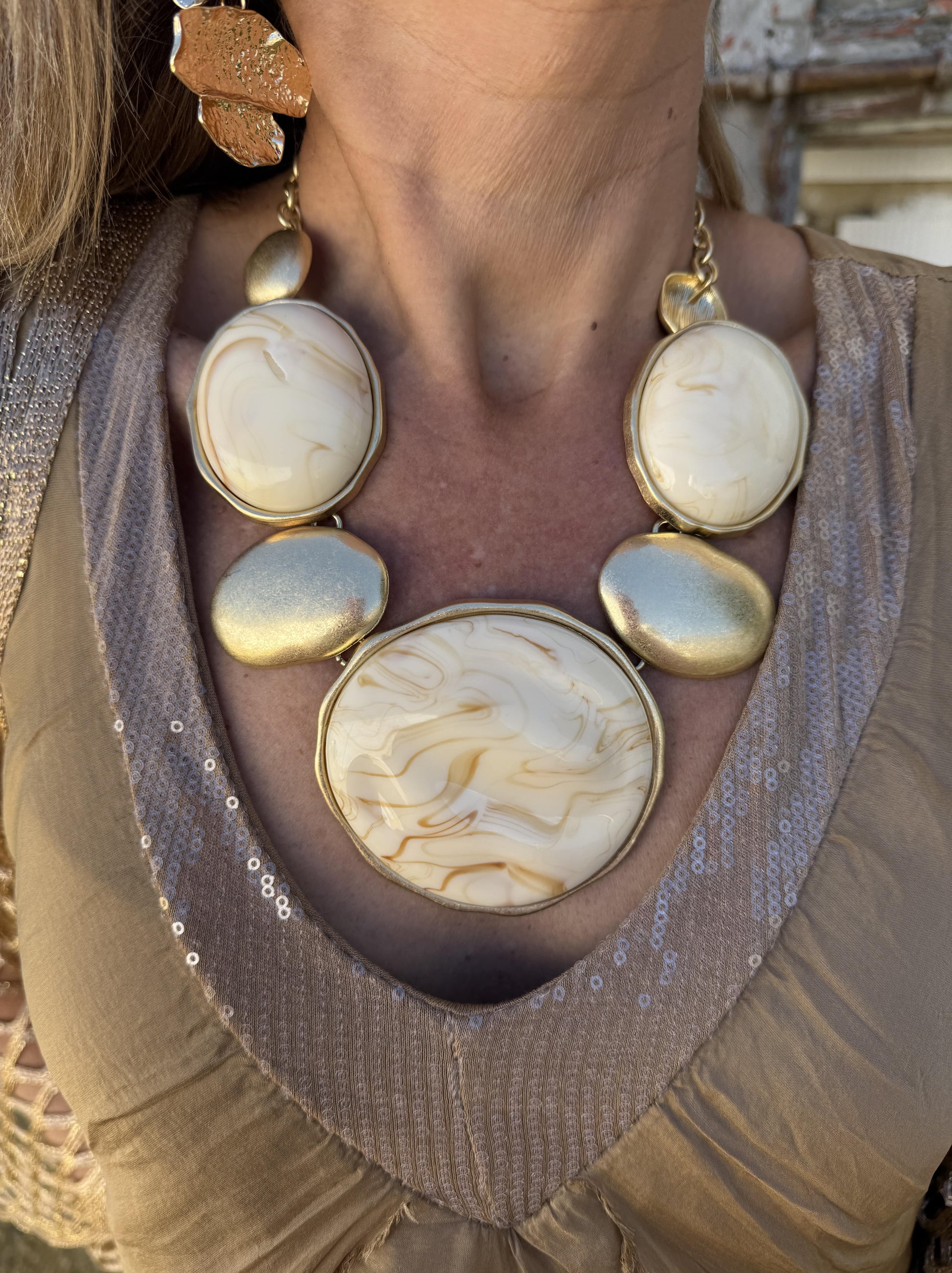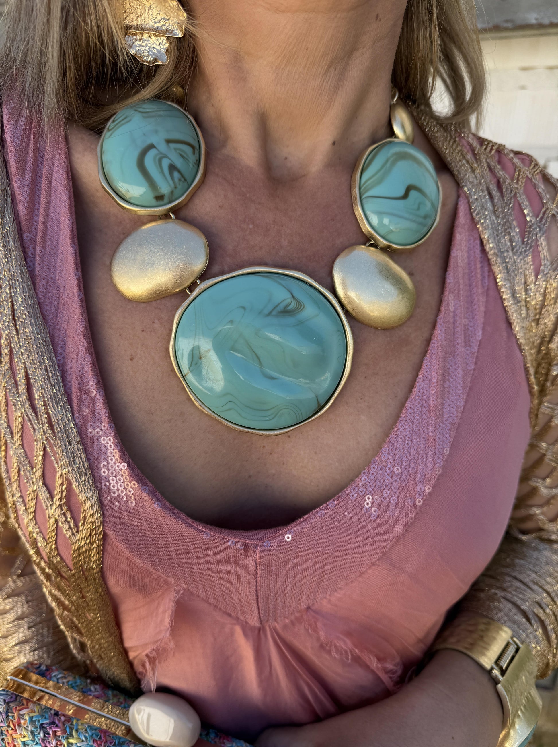 Collar boho chic con círculos de piedra de resina y dorados.