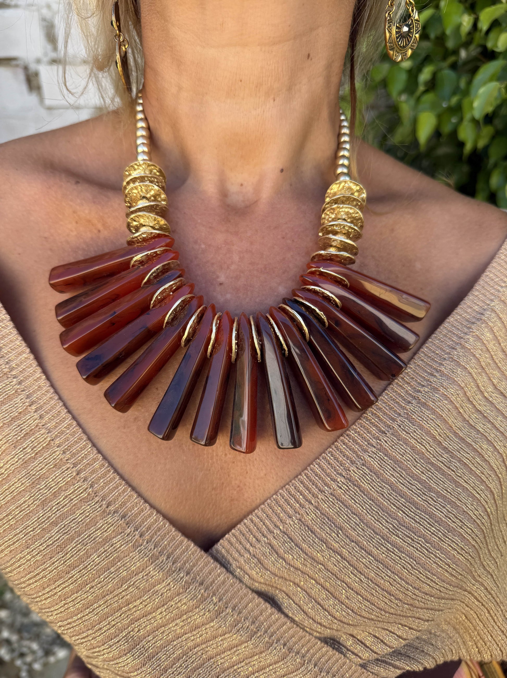 Collar boho chic con piedras de resina alargadas y cuentas en color dorado.