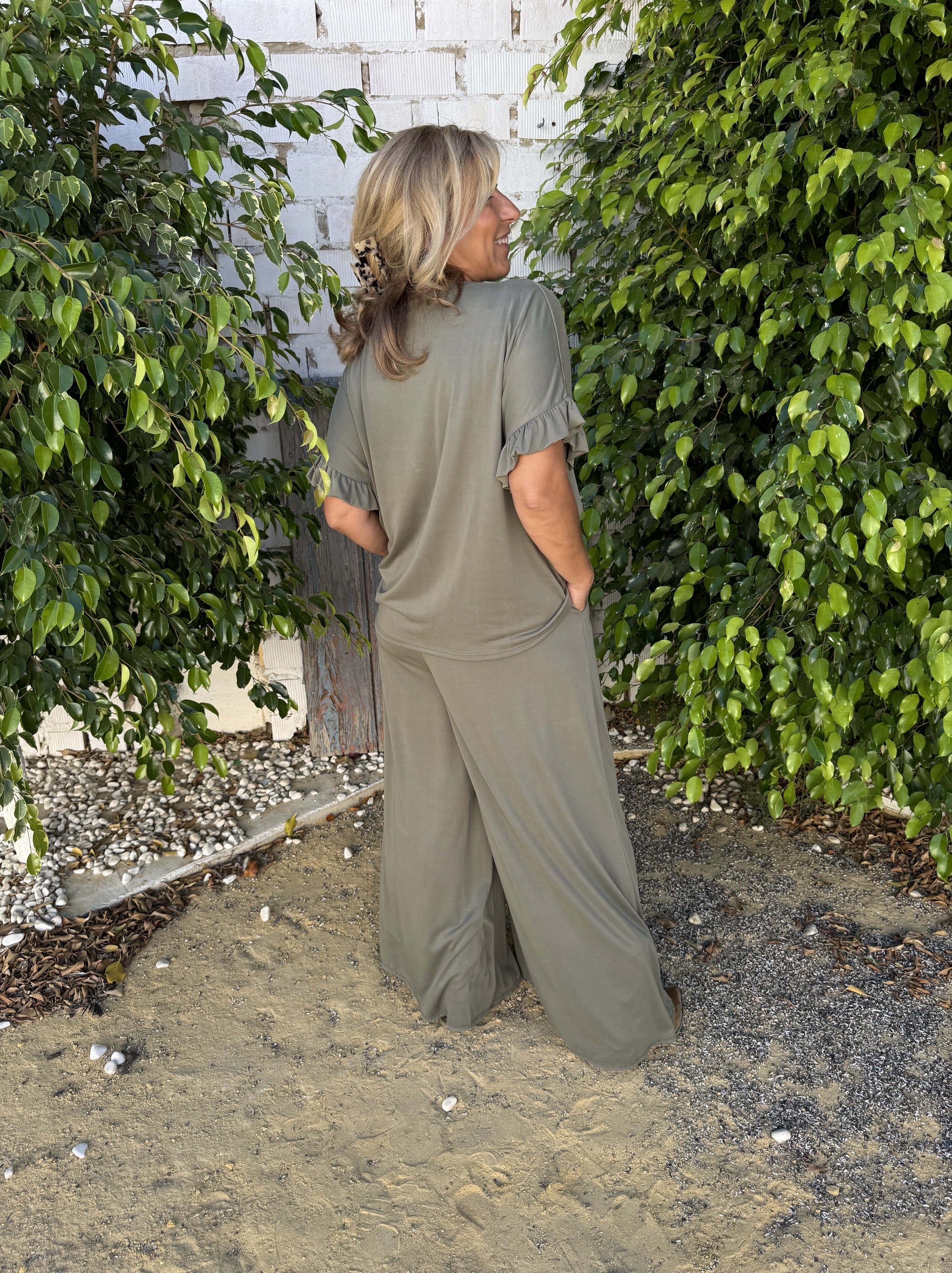 Pantalón pata de elefante fluido con bolsillos a ambos lados. Cintura fruncida elástica y cordón beige.