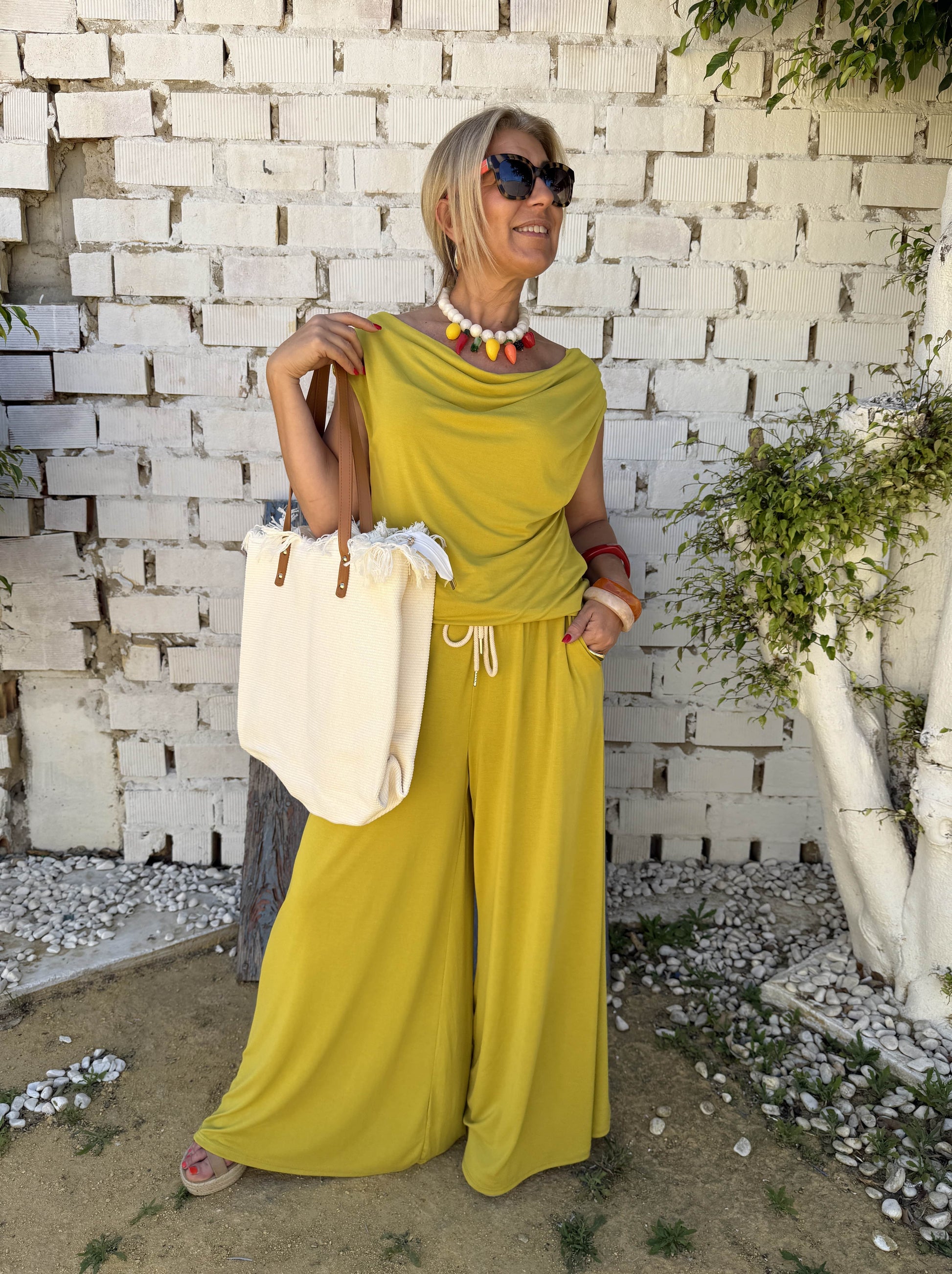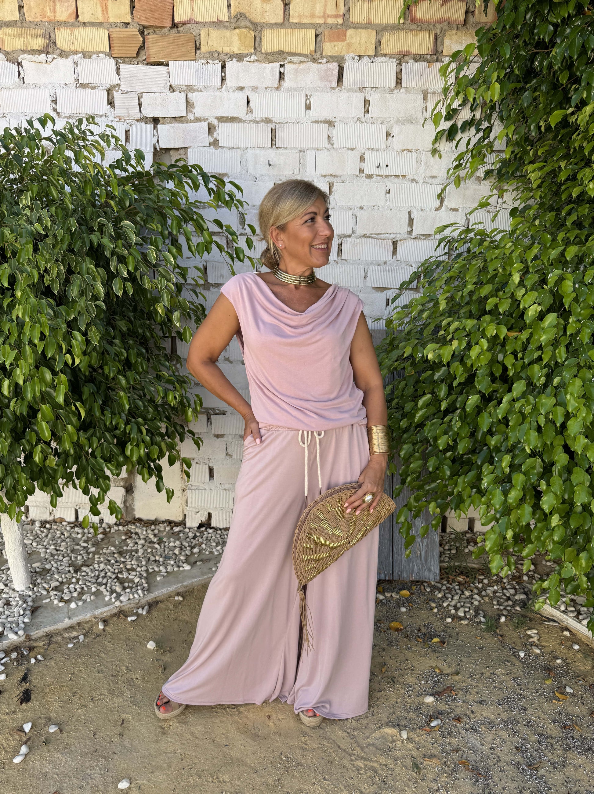 Conjunto fluido de pantalón y blusa.
