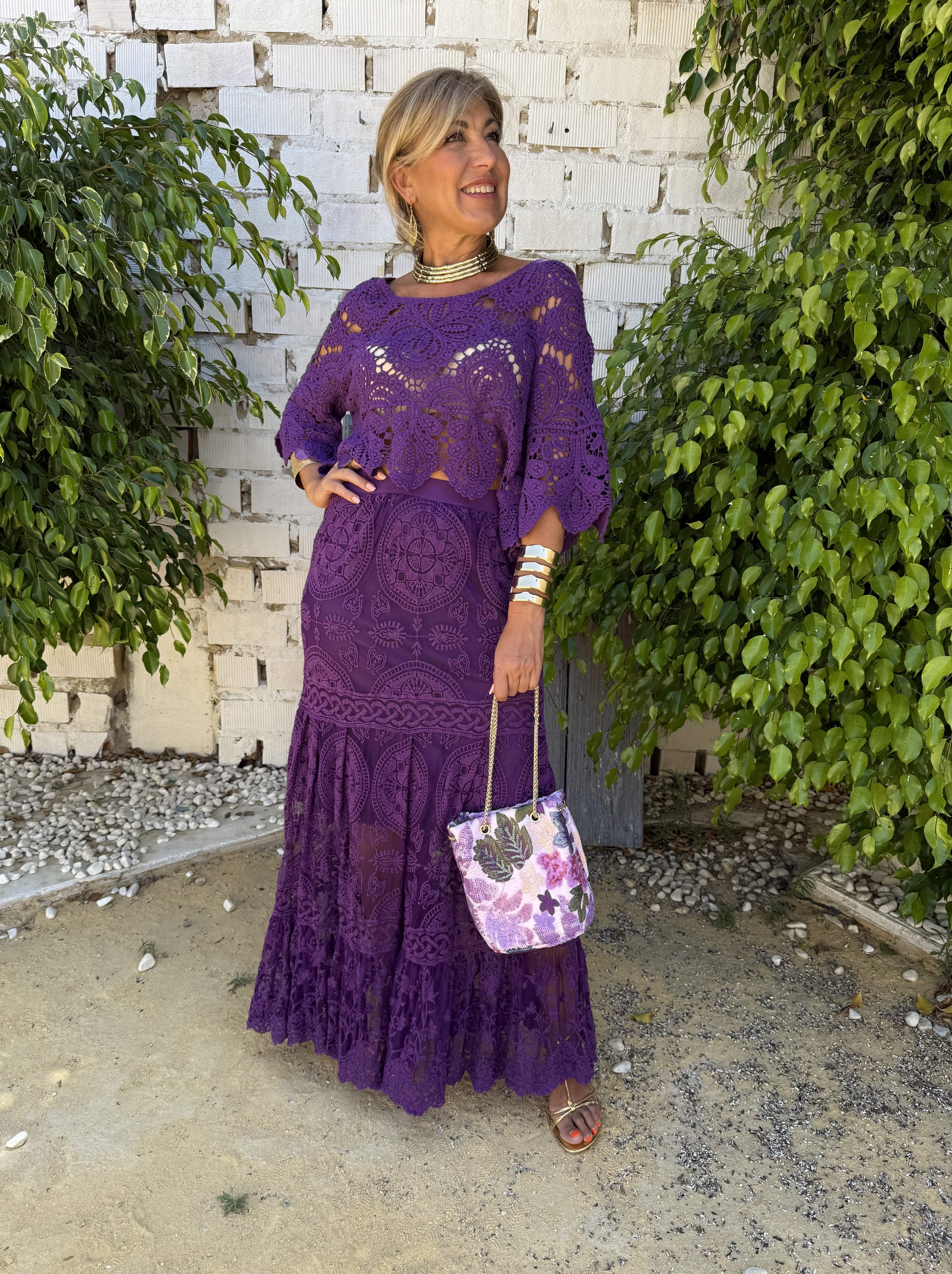 Esta falda es de tul y bordado morado.