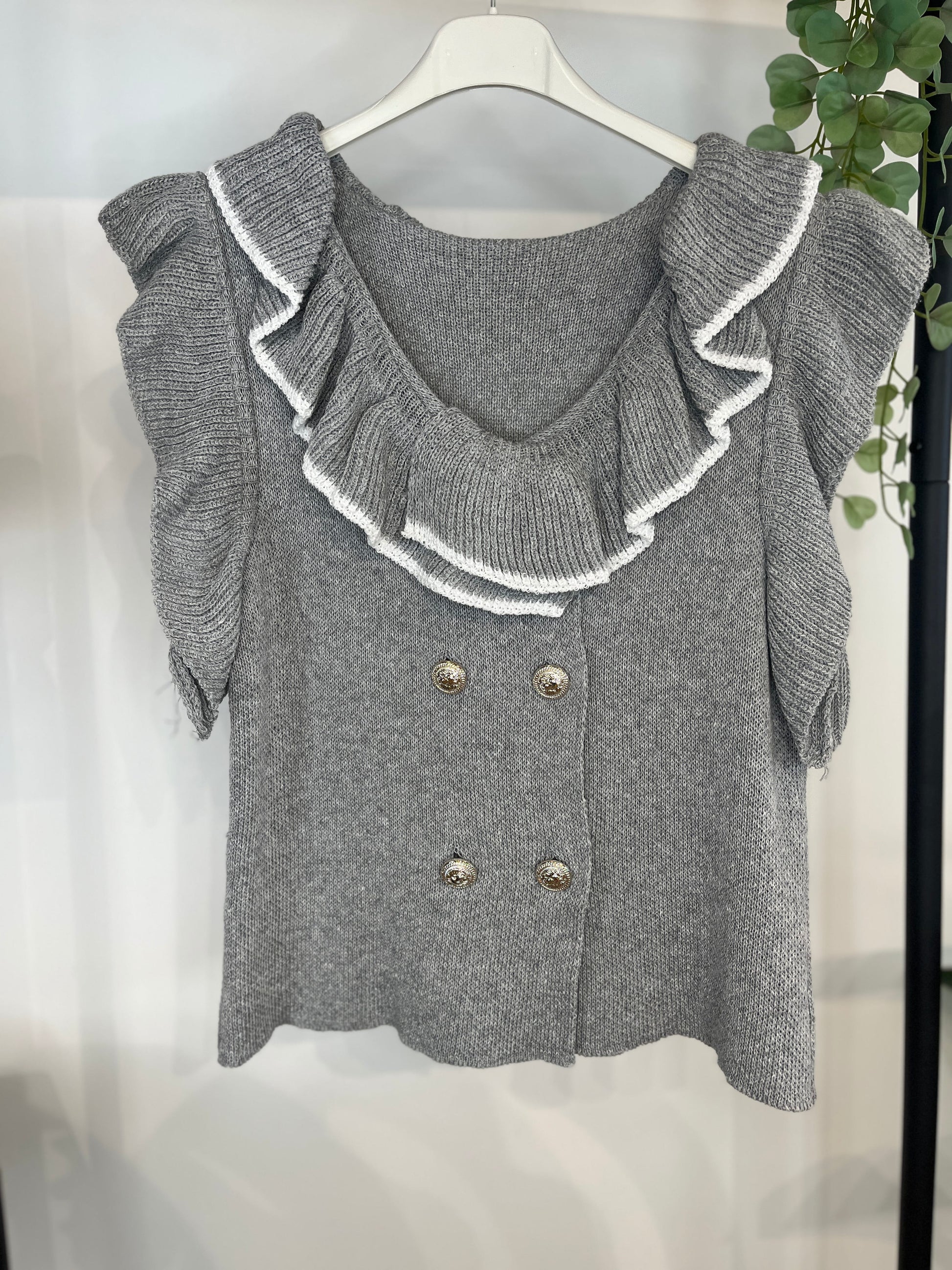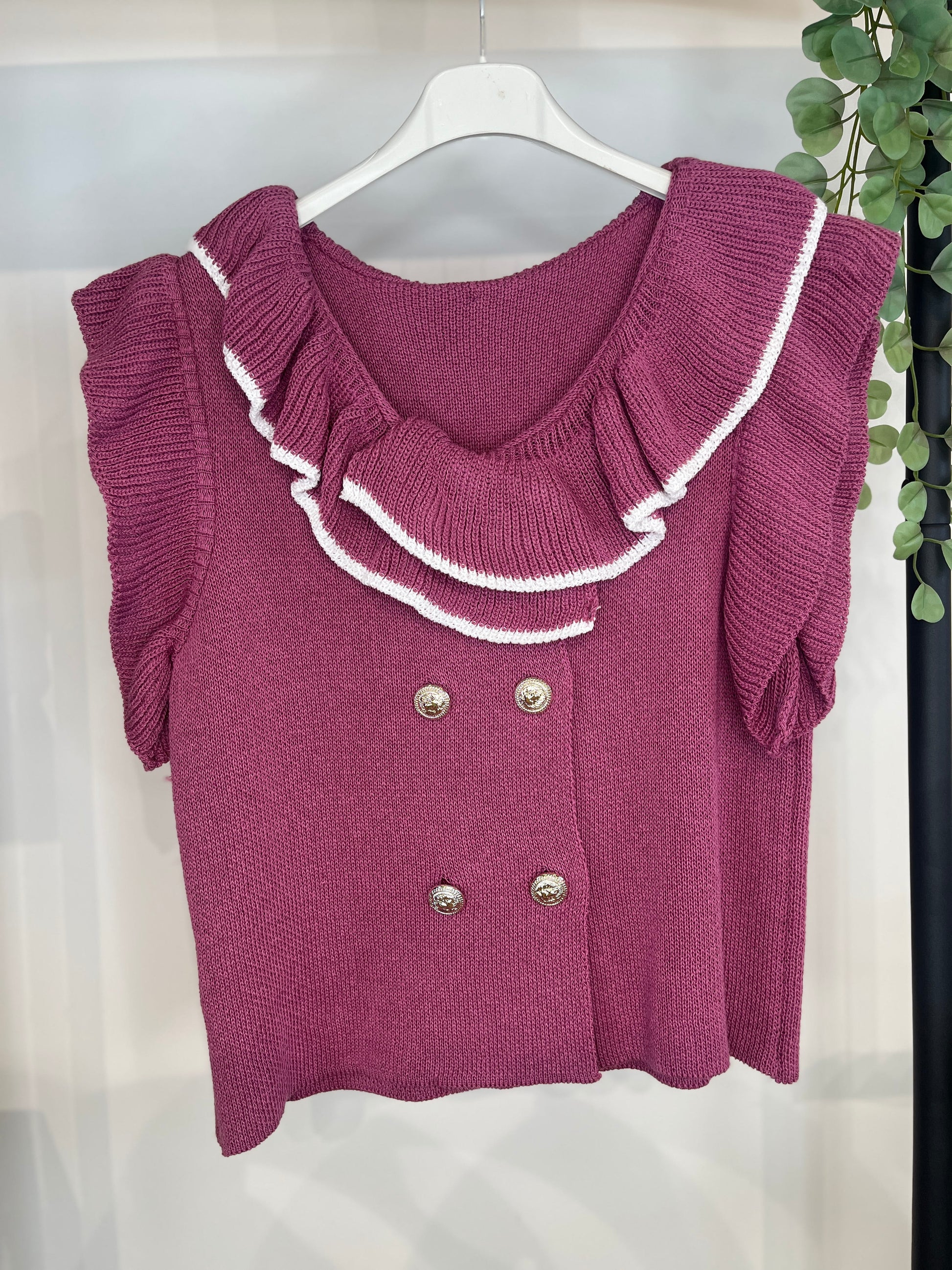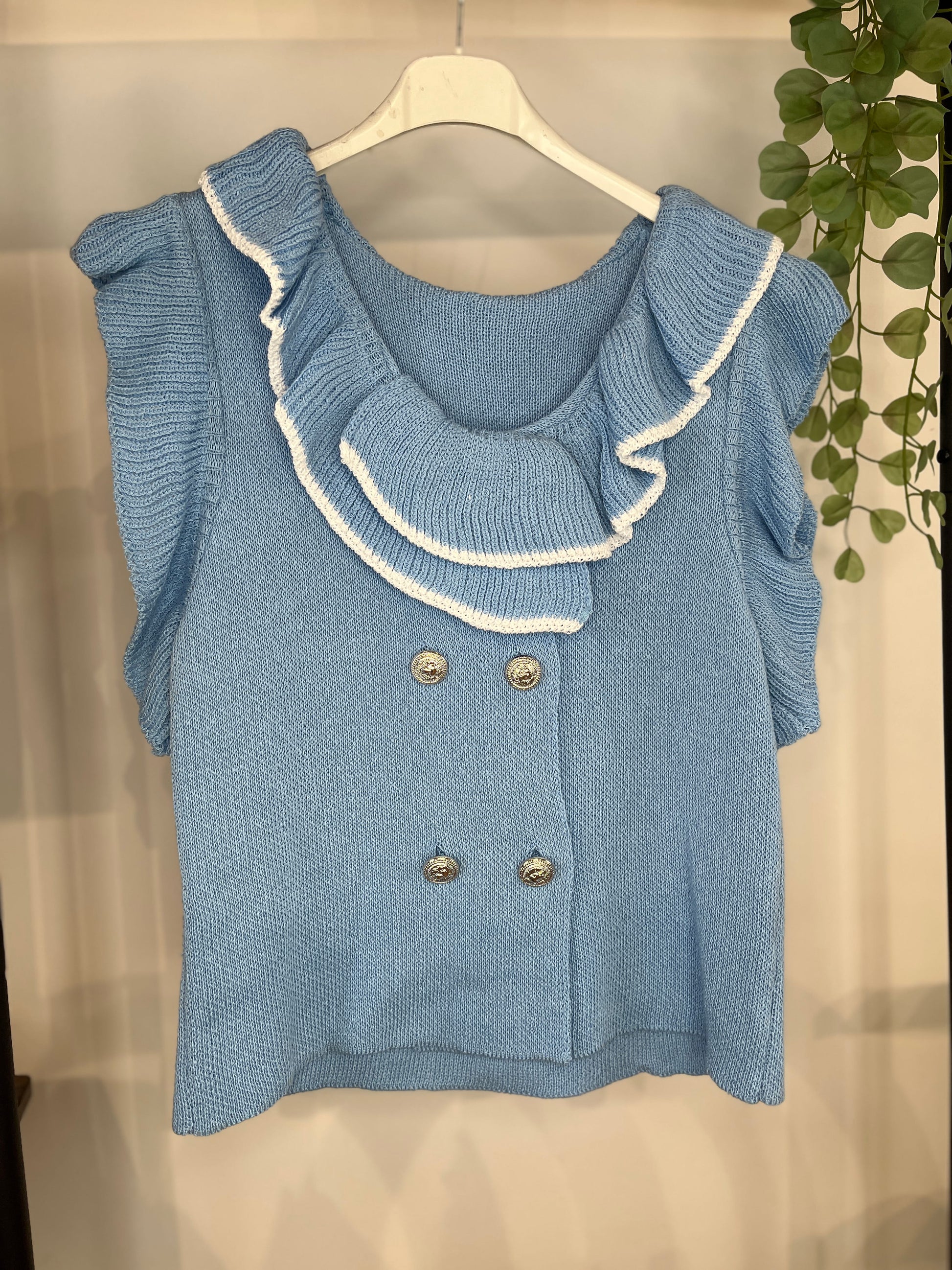 Descubre nuestro jersey sin manga abotonado, una pieza versátil que combina comodidad y estilo. Elaborado en blanco con botones plateados que aportan un acabado premium, cuenta con un delicado filito que define su silueta. Ideal para crear looks estratificados o lucir solo, este jersey se adapta a cualquier ocasión. Elige entre cinco tonalidades cautivadoras: blanco clásico, azul profundo, frambuesa vibrante, verde menta refrescante o gris neutro. Una prenda esencial que eleva tu guardarropa con elegancia y flexibilidad.