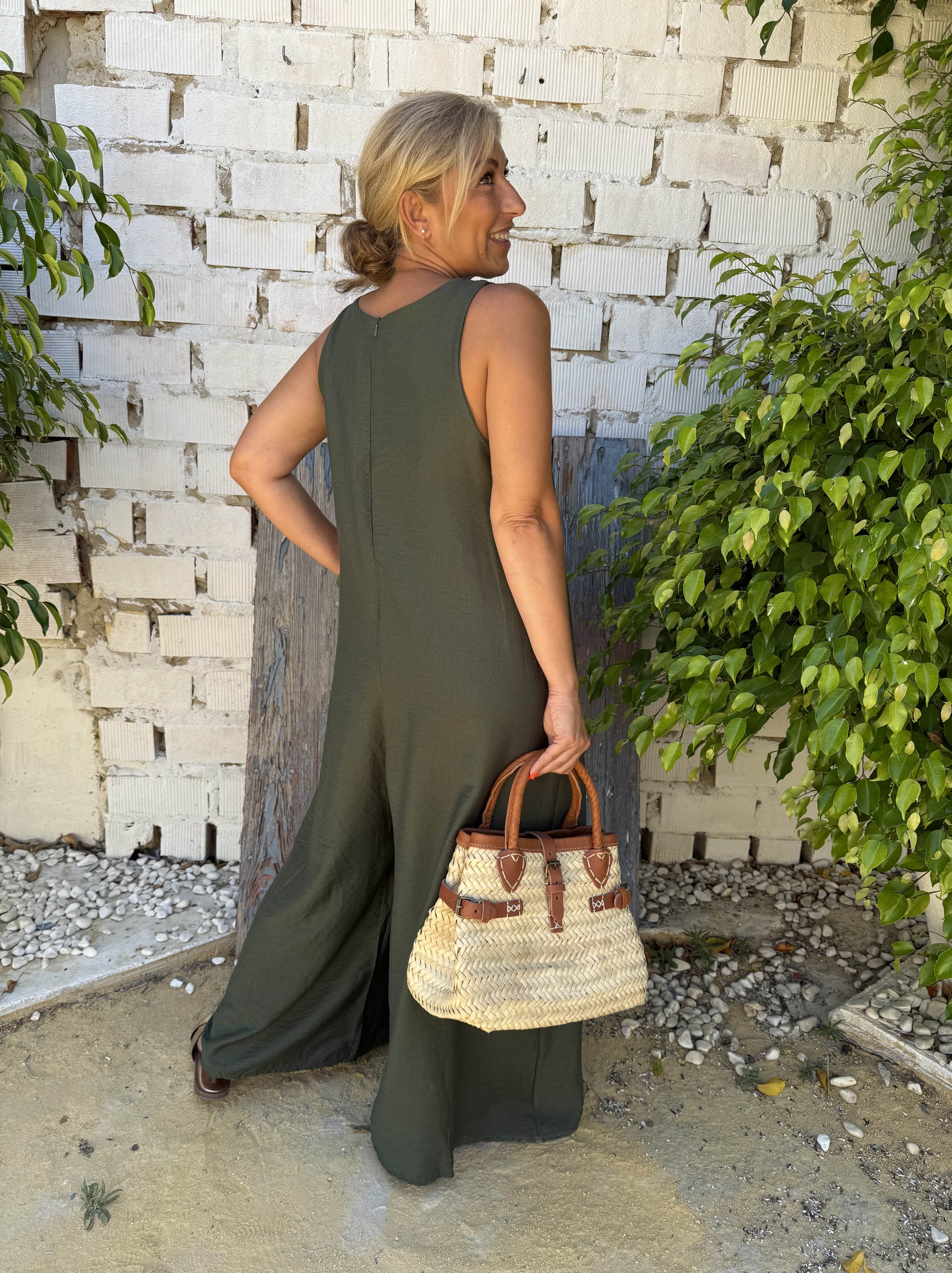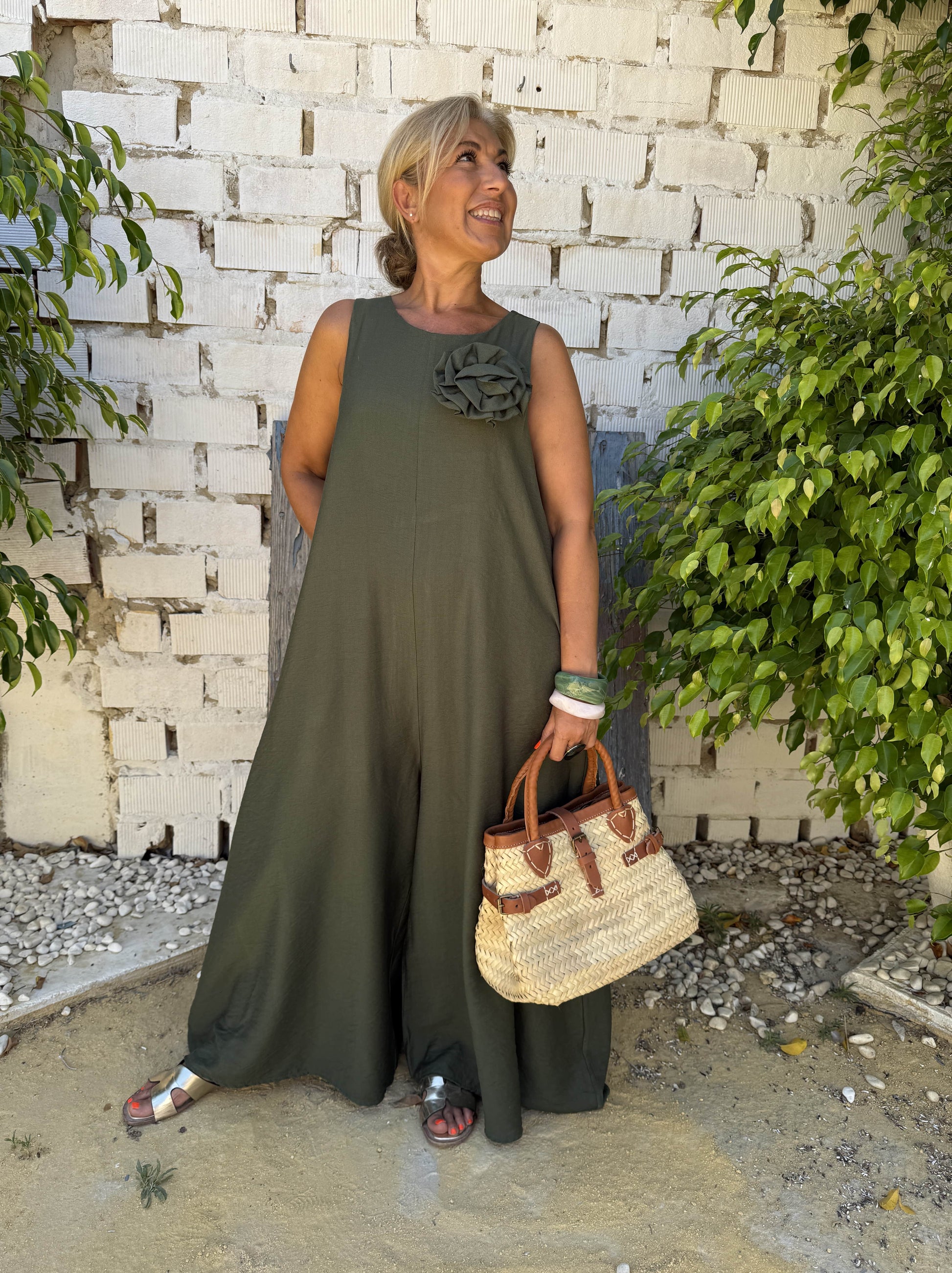 Mono de mujer de tirante ancho, con broche de flor en la zona del pecho.
