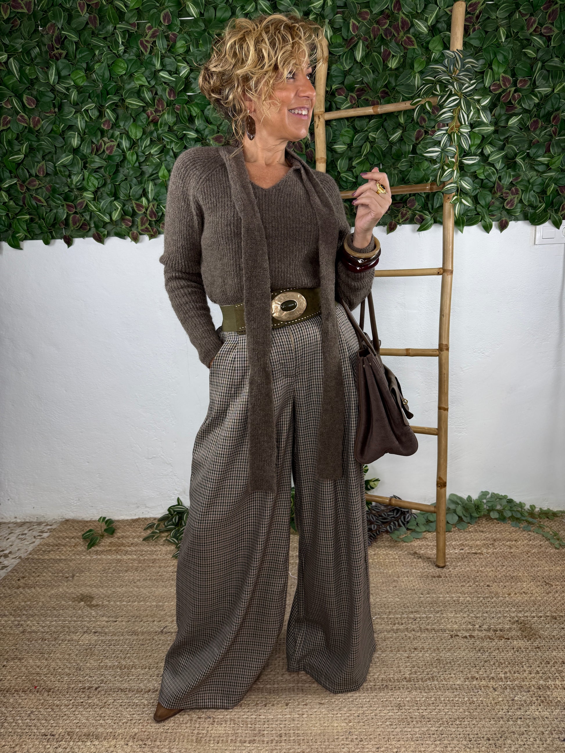 Pantalón de vestir con pata de elefante y estampado de cuadros de colores.