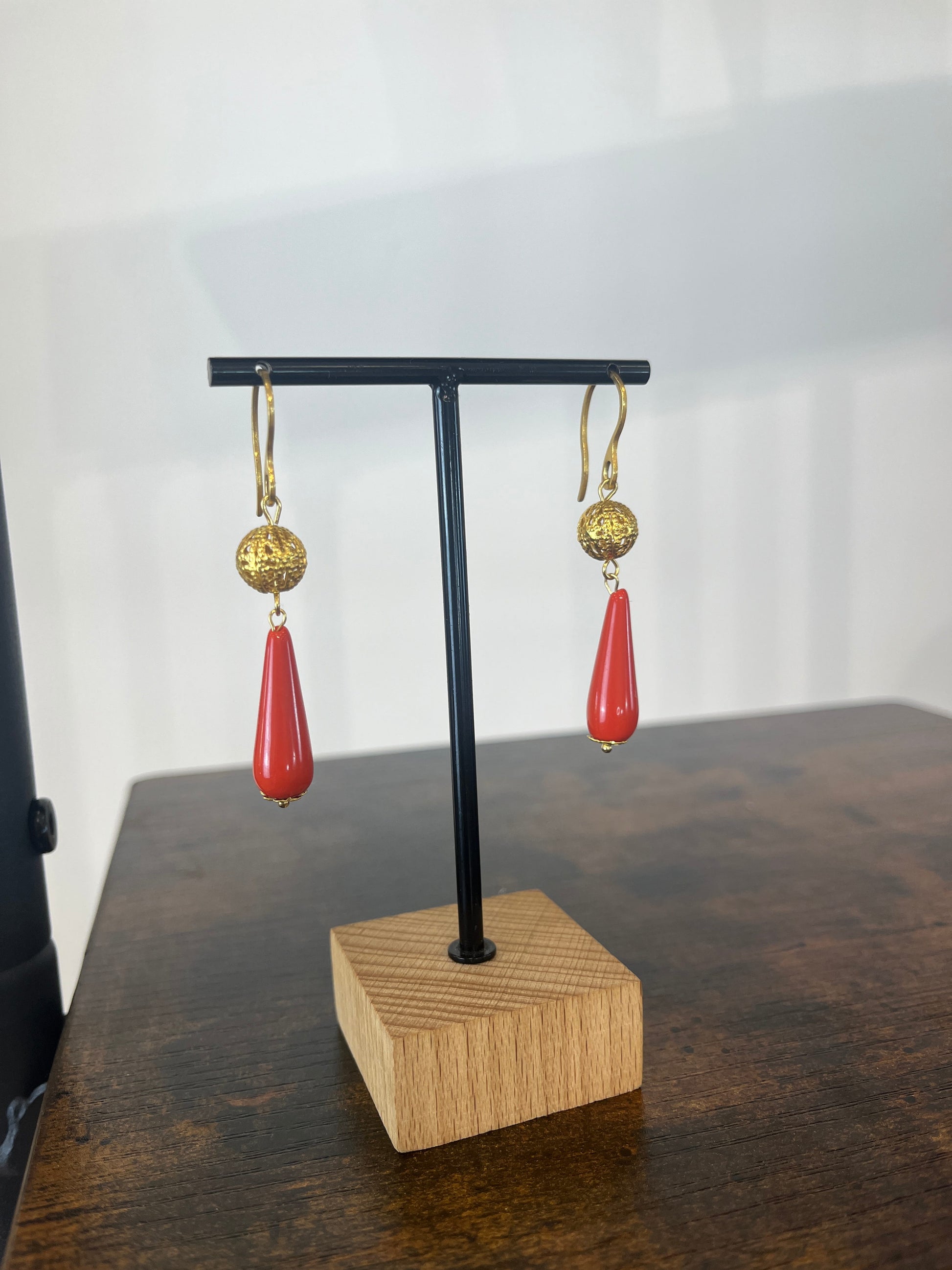 Pendiente de mujer ideal para flamenca con bola en color dorada calada y coral.