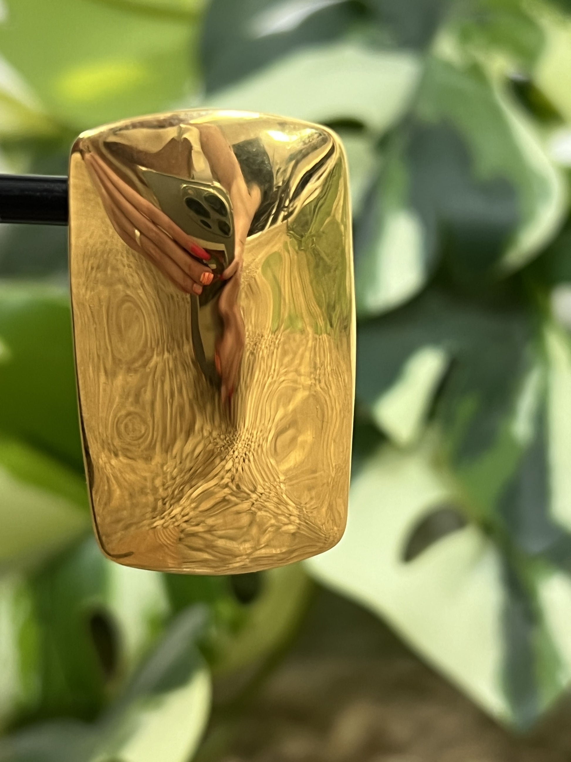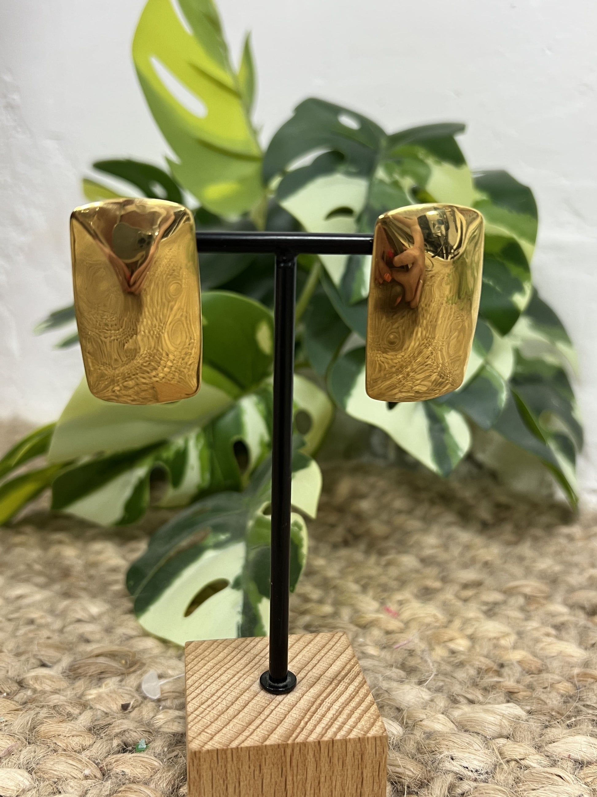 Pendiente de acero en forma rectangular pegado a la oreja en color dorado.