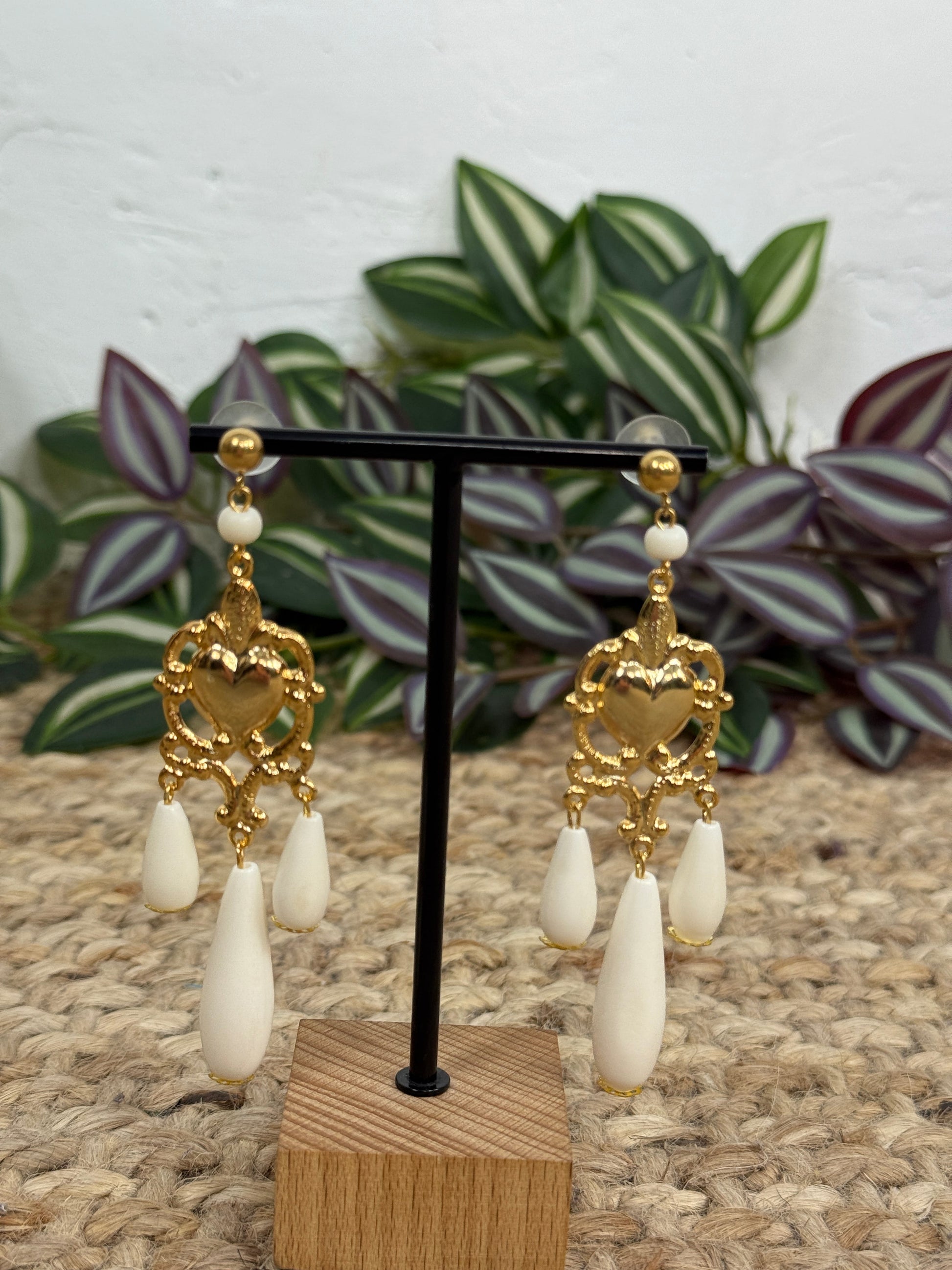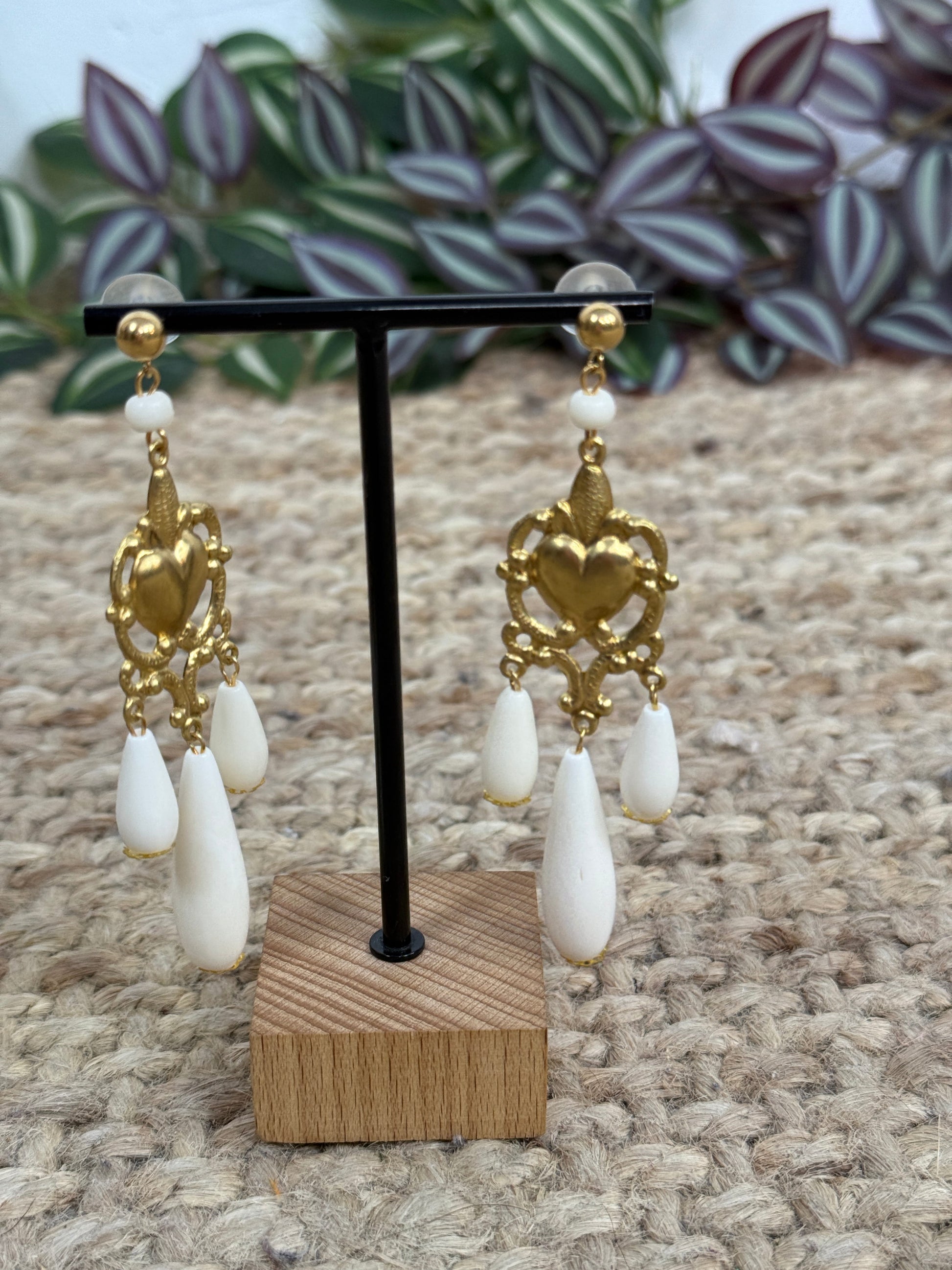 Pendiente largo de mujer compuesto por un corazón dorado y tres corales.