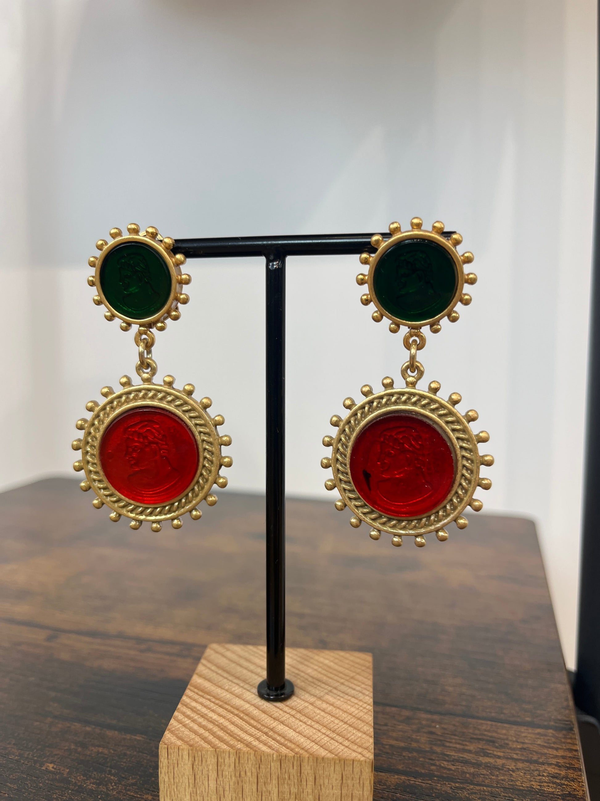 cobre con baño de oro. Diseñados con mondas tipo camafeos combinando rojo y verde.