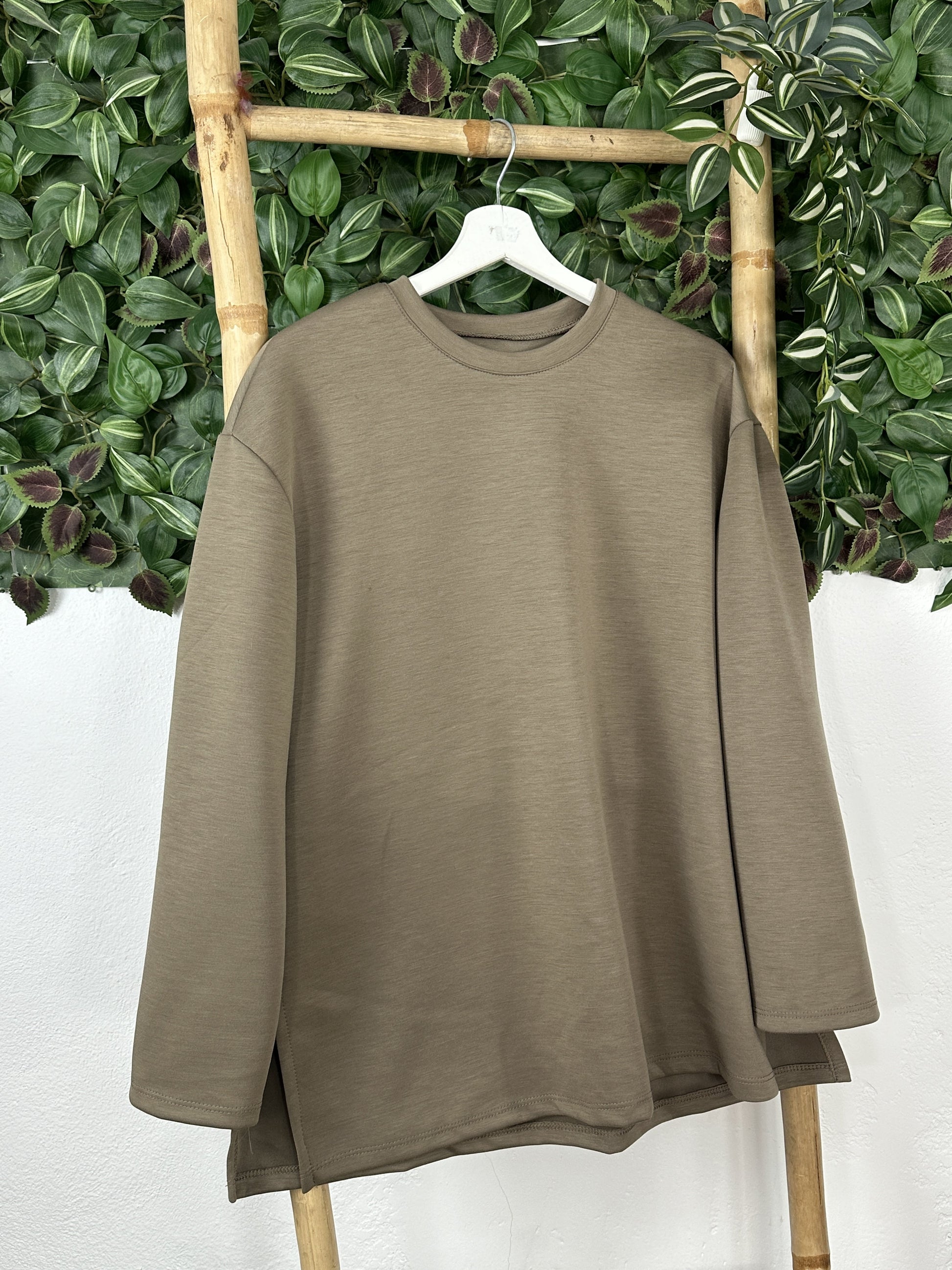 Sudadera de manga larga con cuello de círculo y aperturas a ambos lados del bajo de la sudadera.