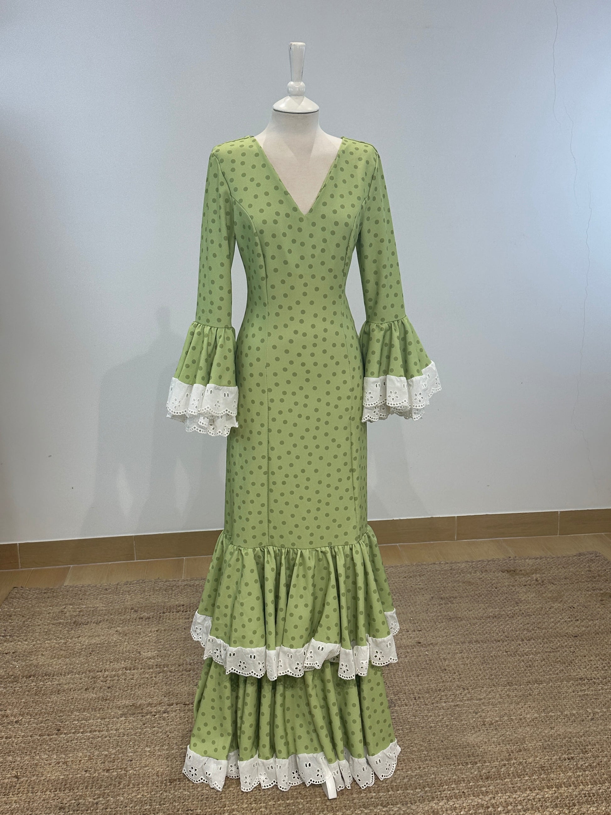 Este traje de flamenca de lunares está disponible en color marrón, caldera, verde, azul, blanco, terracota y negro.