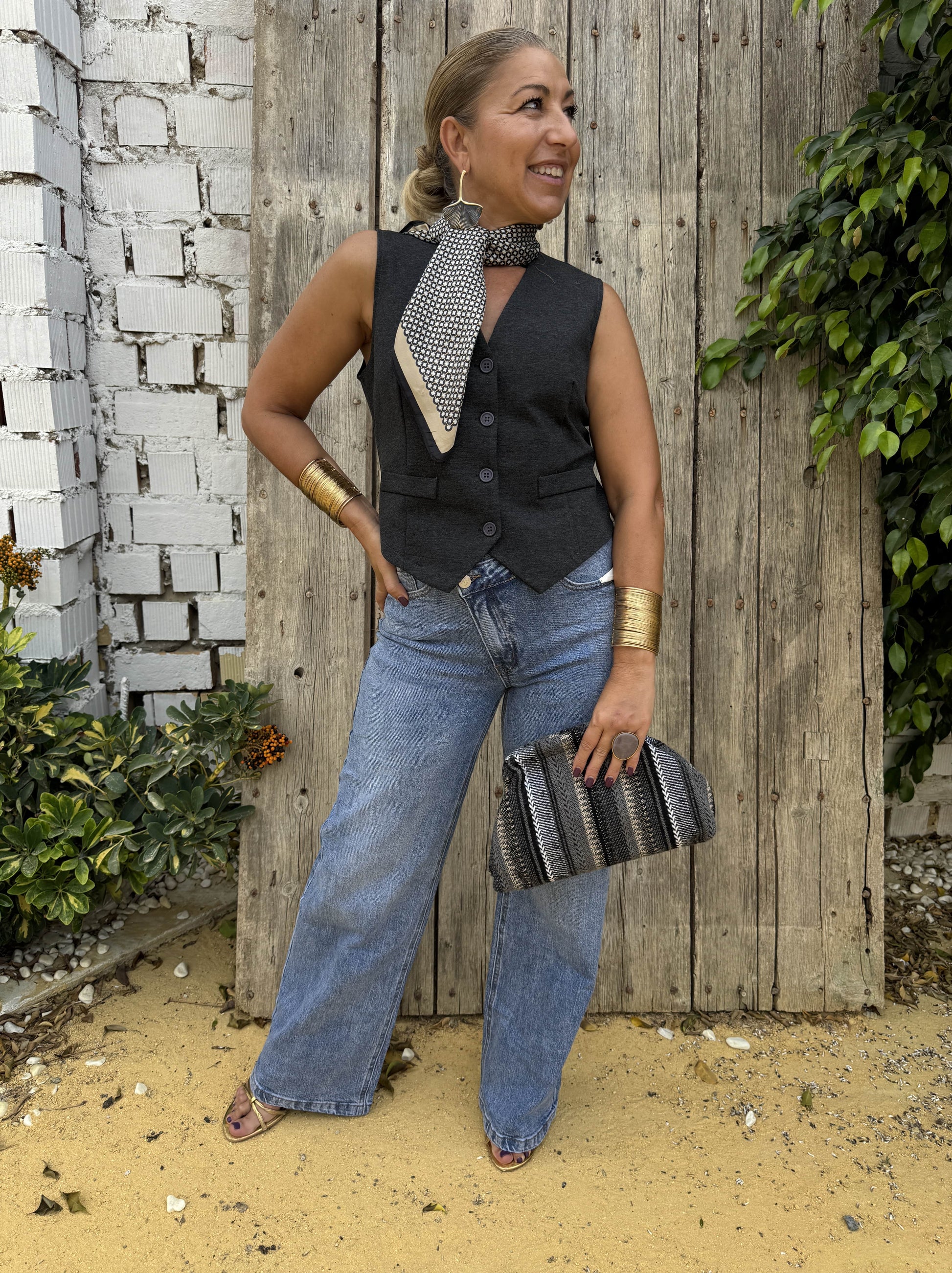 Pantalón vaquero de tiro alto con cintura cruzada.