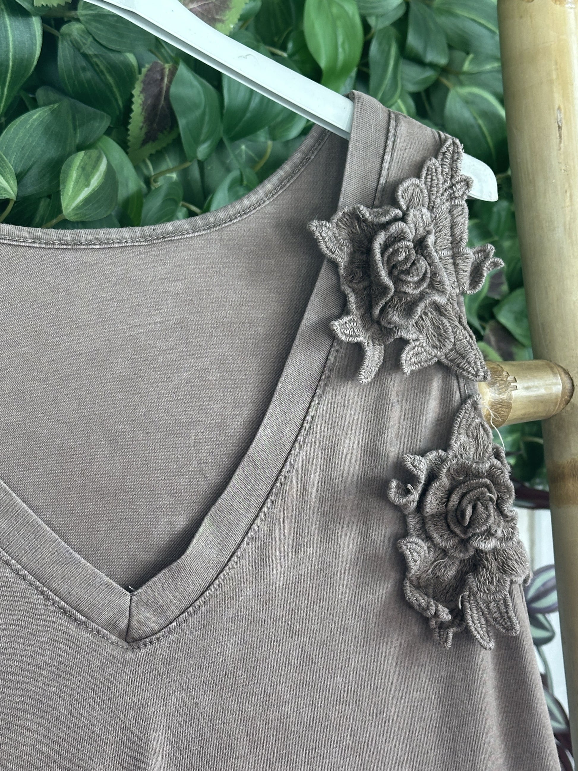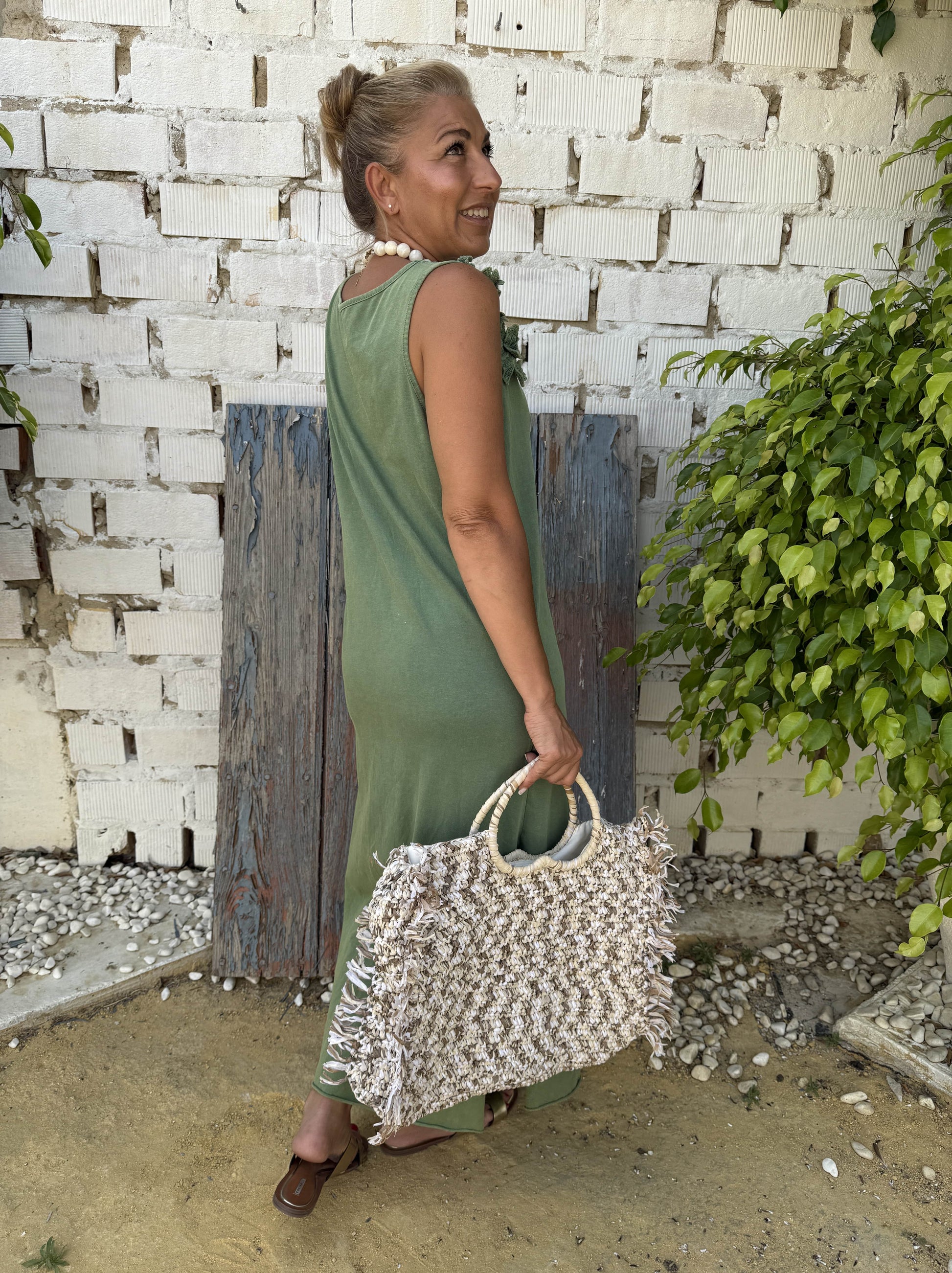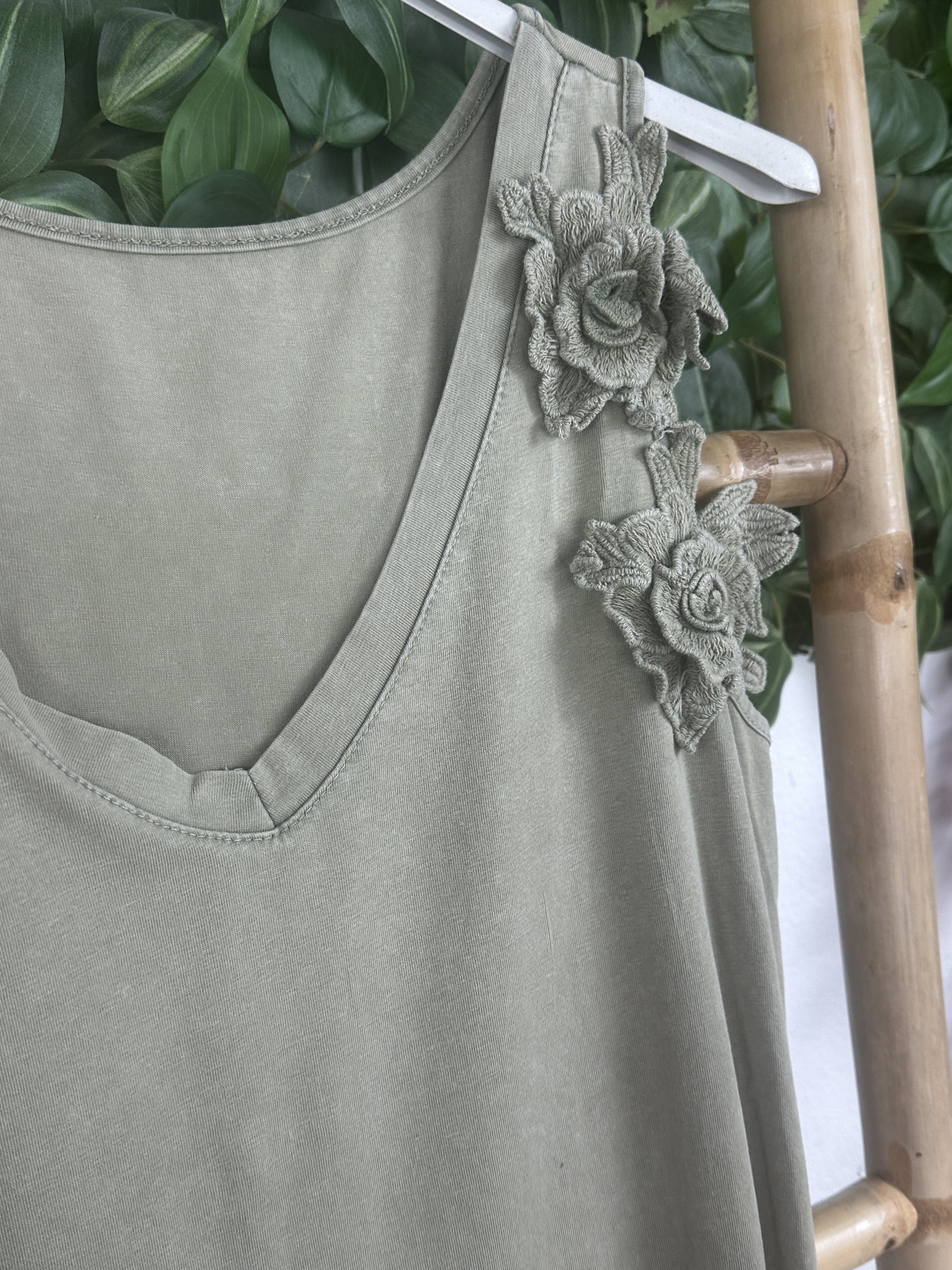 Vestido largo con tejido de camiseta de algodón con flores de relieve 3d en la zona de las tirantas.