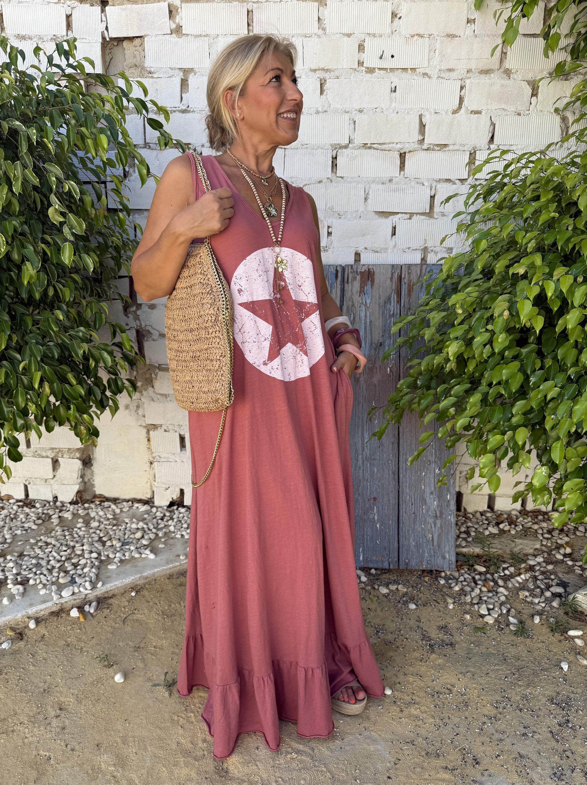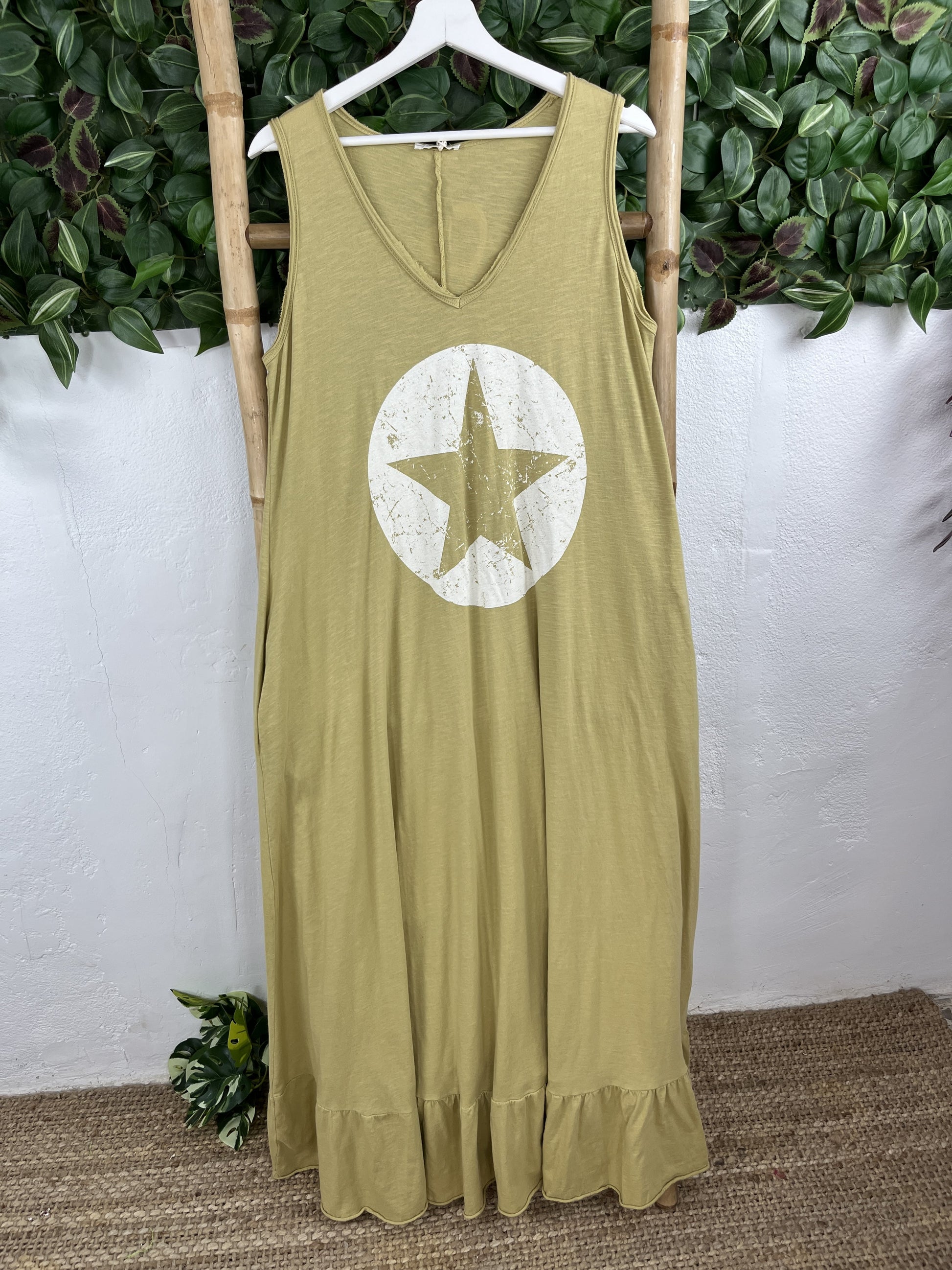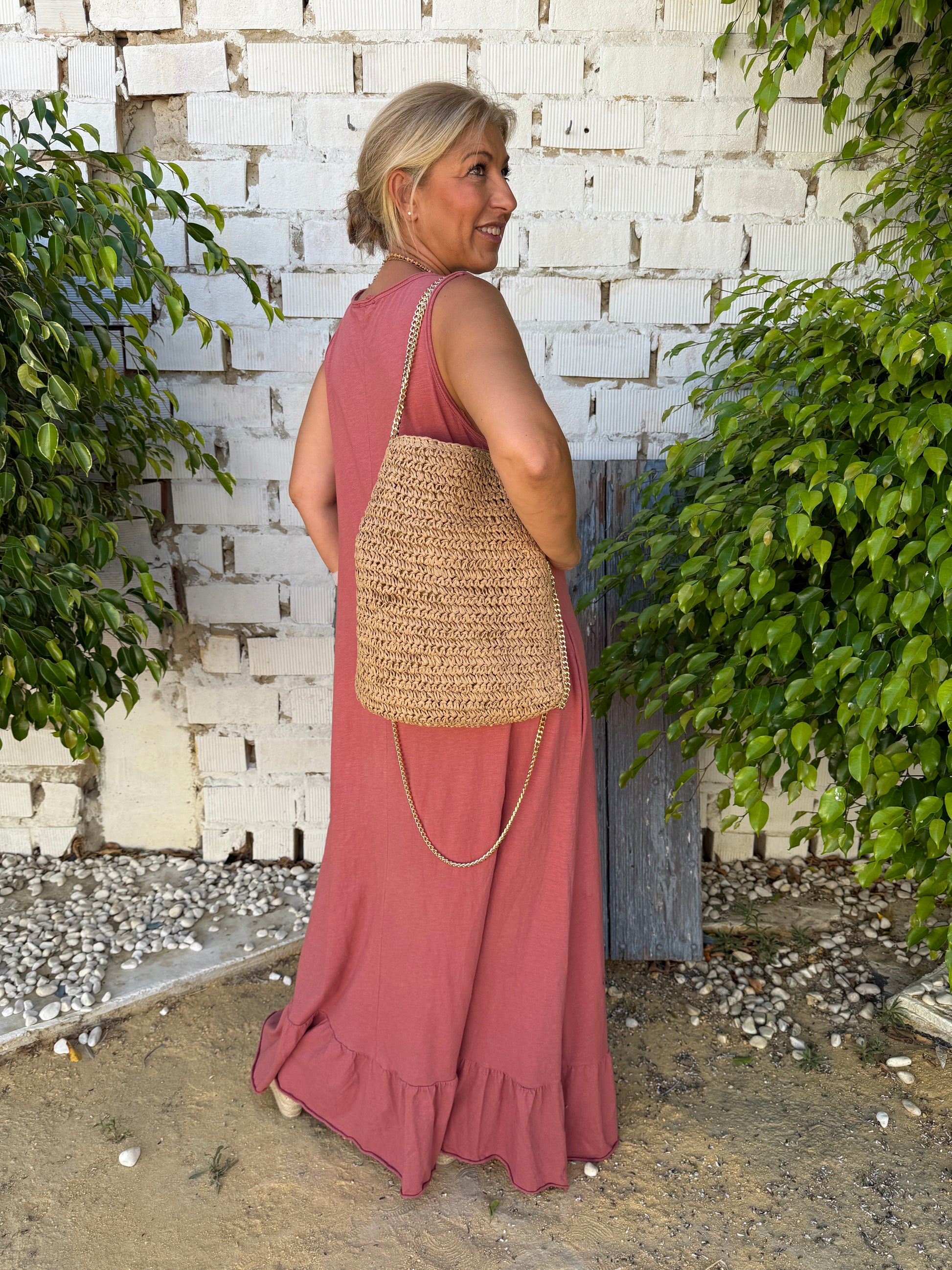 Vestido tipo camiseta de tirantas con escote en forma de pico y volante en el bajo.