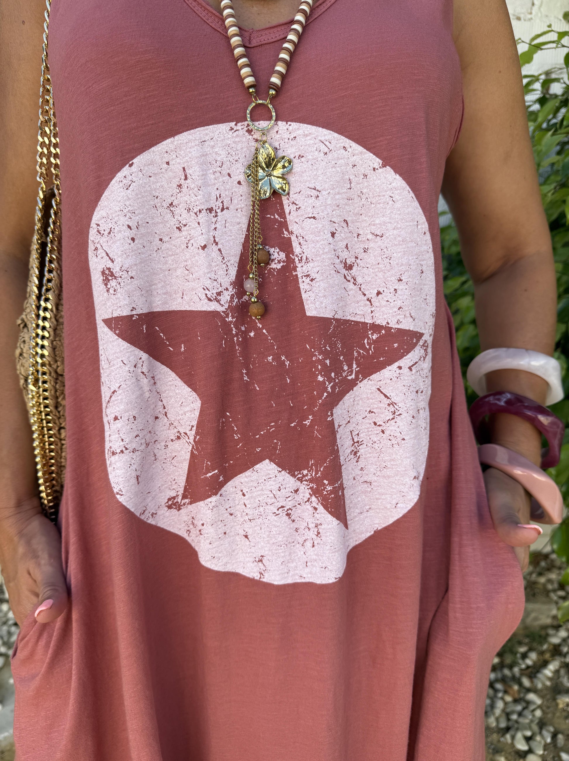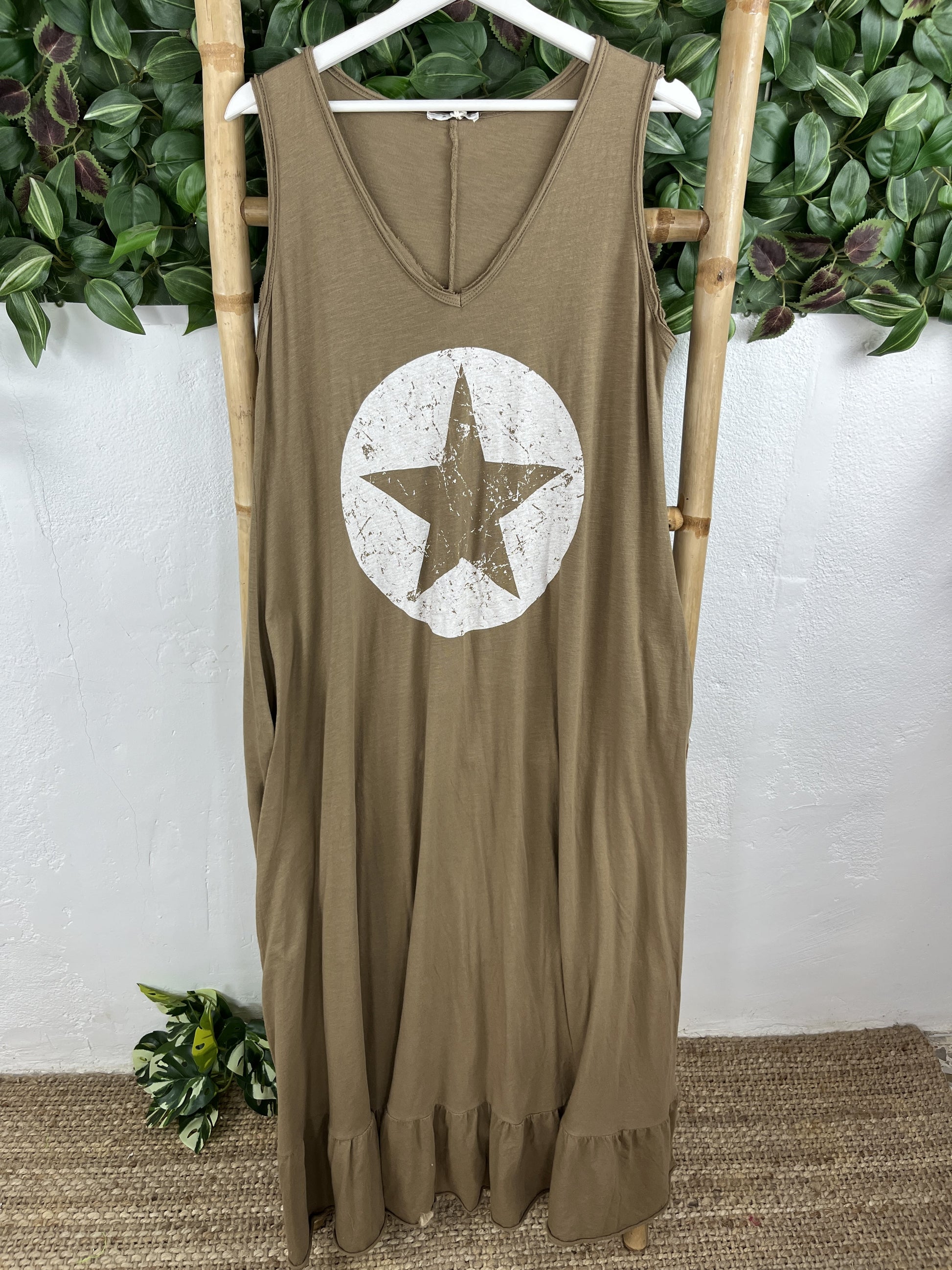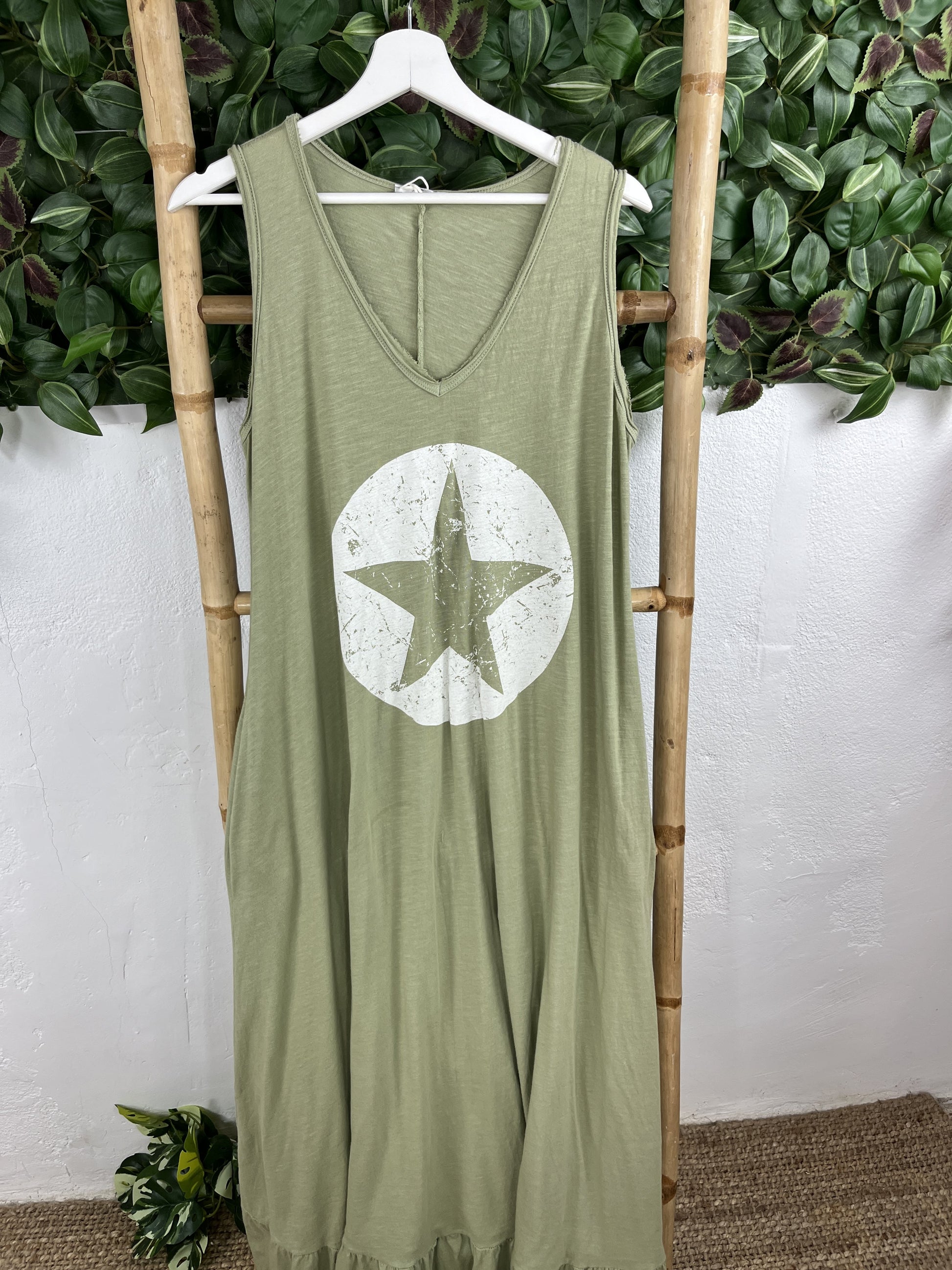 Vestido tipo camiseta de tirantas con escote en forma de pico y volante en el bajo.