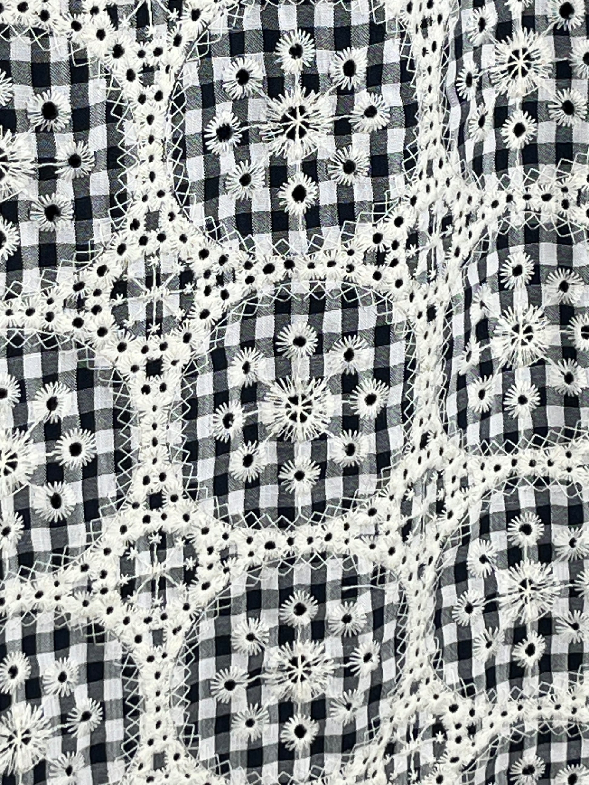 Vestido con estampado de cuadros vichy y brocado en forma de flor bordado en hilo blanco.
